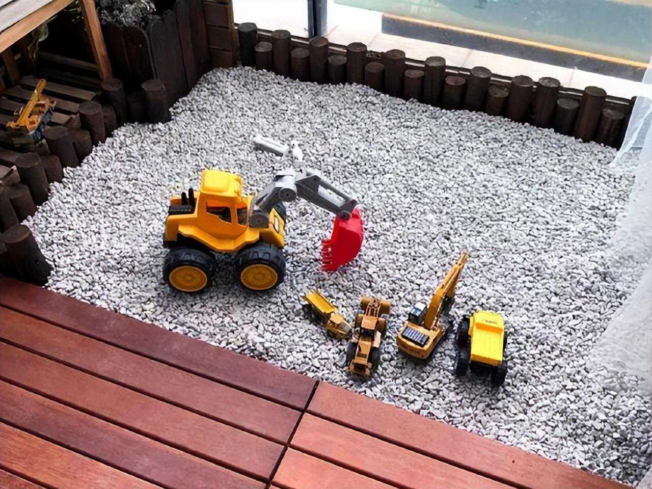 如果家里有孩子的话,在设计的时候还可以一半铺防腐木,空余出来一块场地铺上碎石子供孩子玩耍,给孩子提供一个玩耍的空间,让孩子能够健康快乐的成长。