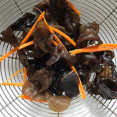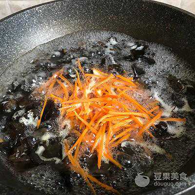 6、黑木耳快熟时加入胡萝卜丝,一起烫熟