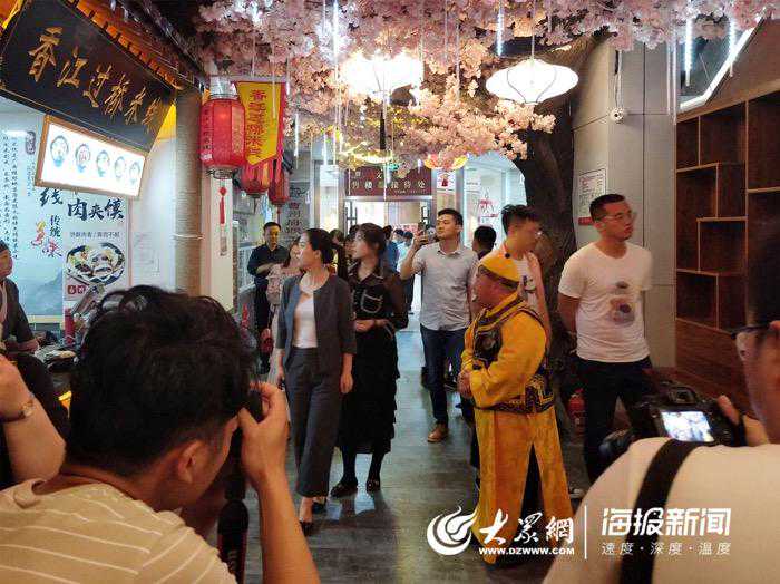 随后,媒体团来到曹州府,曹州府作为菏泽文化城的代表项目,被誉为“菏泽人的公共待客厅”,大众网记者看到每家店内环境整洁,屋顶设置了蓝天白云的背景,在顾客吃饭时带来愉悦的享受。曹州府共有三层,里面有烧饼、水煎包、羊肉汤小龙虾、酸辣粉等地方特色小吃,也有府东名吃、胶东人家、火锅等饭店。时至饭点,小吃摊前站满了排队的人群,饭店里面也人气满满。