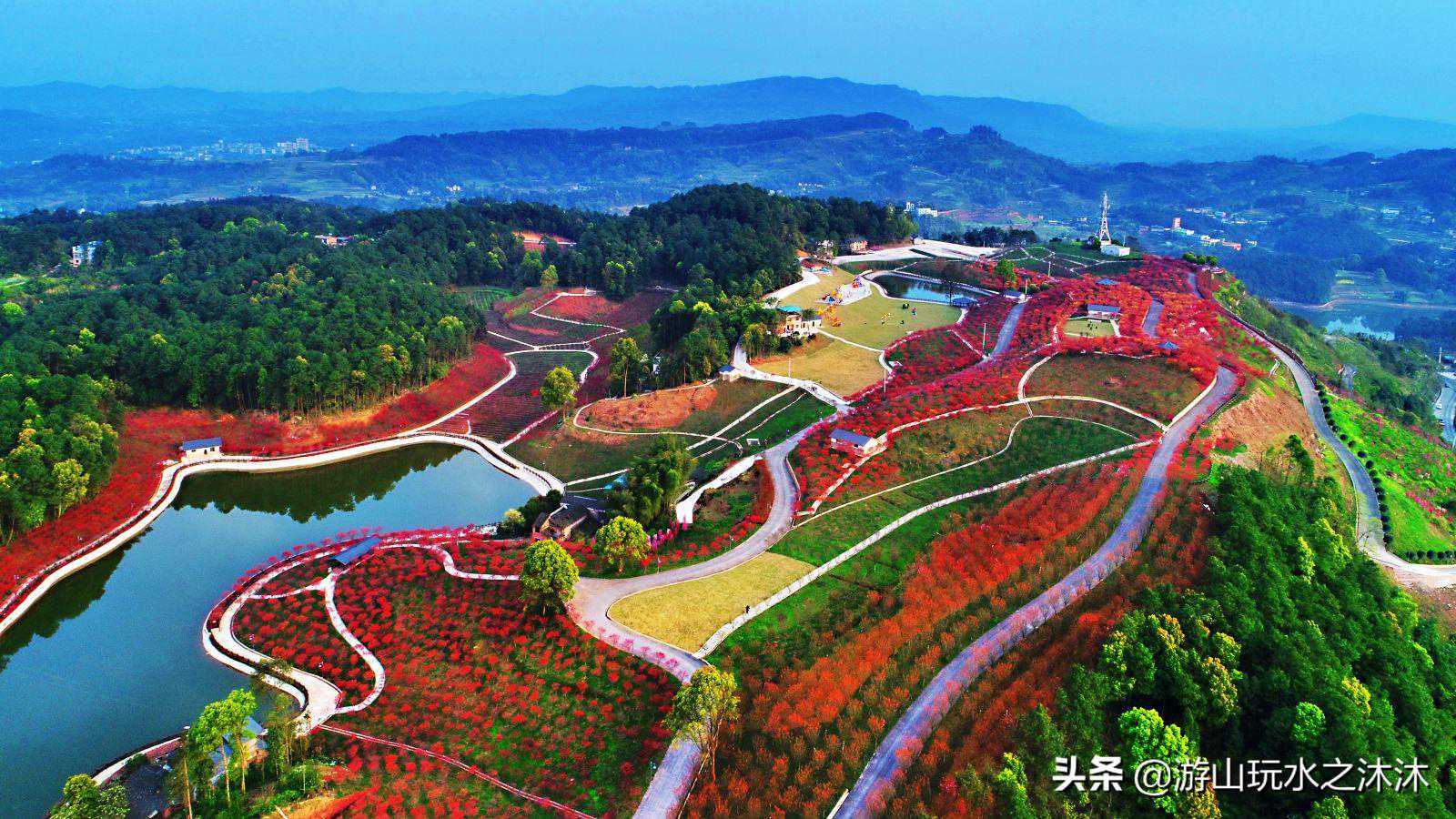 阳光下漫山遍野的红枫与天际线相连,似一道道火红夕阳铺满天边,红艳艳、金灿灿,蔚为壮观。