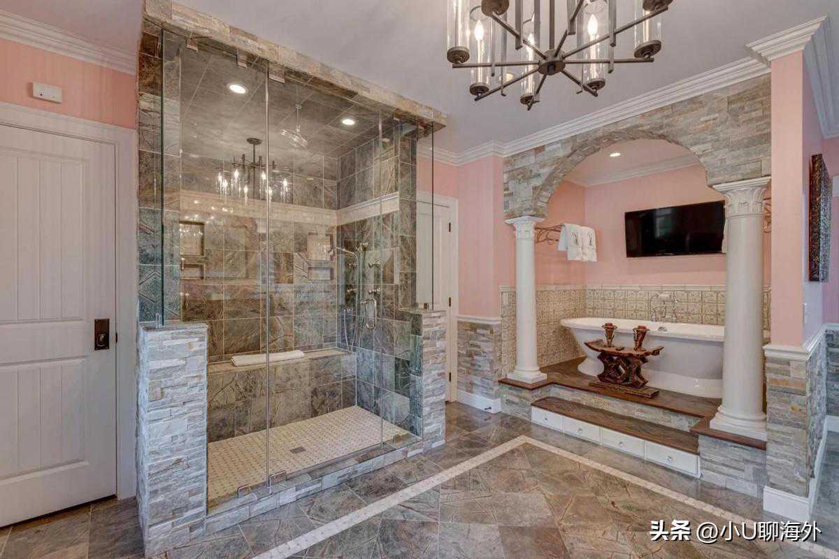 别墅内有6个卫浴间,主浴室内拥有非常齐全的配套设施,包括双洗漱台、淋浴间(也是桑拿房)、按摩浴缸,浴缸旁还有壁挂电视,您可以边放松边观看电视节目。此外,浴室旁还有一间大型衣帽间,两面墙的定制衣橱,将您所有的精美衣物都容纳其中。