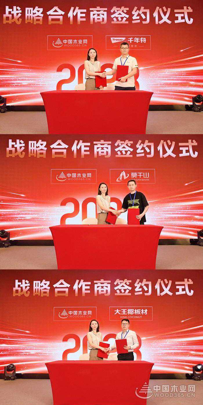 会议现场,杭州大王椰控股集团有限公司(大王椰)、千年舟新材科技集团股份有限公司(千年舟)、浙江升华云峰新材股份有限公司(莫干山)、山东隆饰木业有限公司(隆饰)、巴中建丰新材料有限公司(建丰)、吉林森工露水河科技集团有限公司(露水河)、河北建丰木业有限公司(励木)上台与中国木业网董事长李钰娇进行战略合作商签约,借助行业专业媒体的力量为品牌强势赋能,双方携手同行,共创行业辉煌。