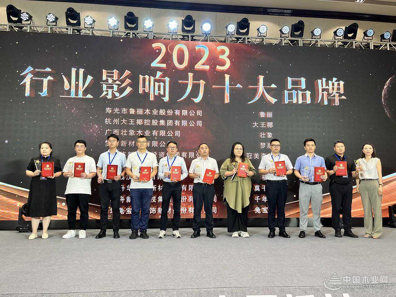 荣获“行业影响力十大品牌”奖项的有:(寿光市鲁丽木业股份有限公司)鲁丽、(杭州大王椰控股集团有限公司)大王椰、(广西壮象木业有限公司)壮象、(梦牌新材料有限公司)梦牌、(广西伟新木业投资集团有限公司)冠美森源、(武汉市鹰冠木业有限公司)鹰冠、(湖北福汉木业有限公司)福汉、(浙江升华云峰新材股份有限公司)莫干山、(千年舟新材科技集团股份有限公司)千年舟、(德华兔宝宝装饰新材股份有限公司)兔宝宝。