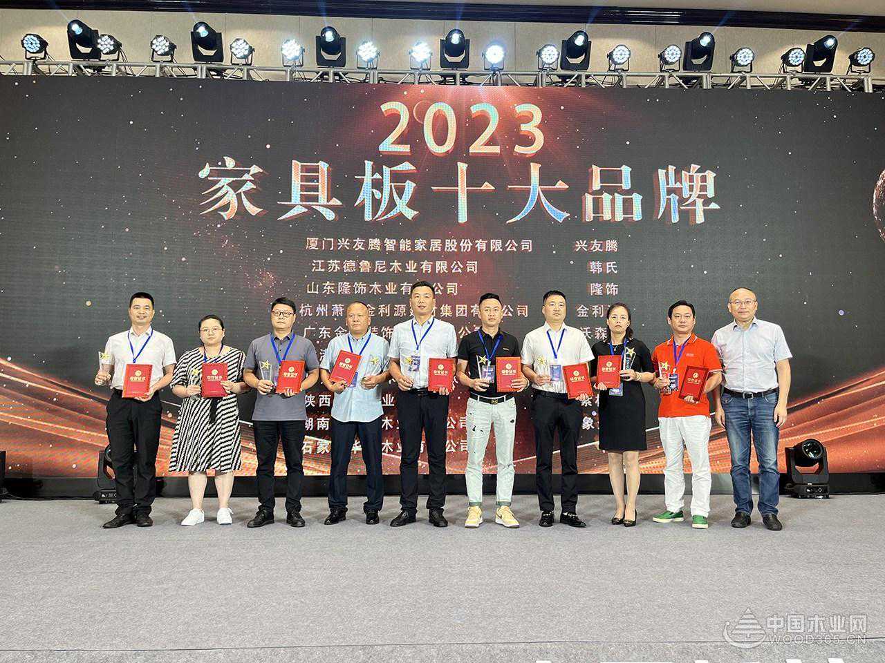 荣获“家具板十大品牌”奖项的有:(厦门兴友腾智能家居股份有限公司)兴友腾、(江苏德鲁尼木业有限公司)韩氏、(山东隆饰木业有限公司)隆饰、(杭州萧山金利源建材集团有限公司)金利源、(广东金兔装饰材料有限公司)沃森川、(香港上品国际家居科技集团有限公司)安氏亚森、(广州市伟正木制品有限公司)伟业、(陕西甲友木业)紫柏山、(湖南旺德府木业有限公司)万象天冠、(石家庄华杰木业有限公司)华杰。