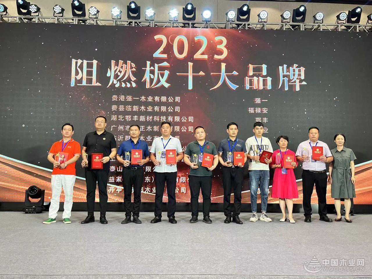 荣获“阻燃板十大品牌”奖项的有:(贵港强一木业有限公司)强一、(费县临新木业有限公司)福禄安、(湖北鄂丰新材科技有限公司)鄂丰、(广州市伟正木制品有限公司)伟业、(临沂群豪木业有限公司)群豪、(北京盛大华源科技有限公司)盛大华源、(上海木易阻燃材料有限公司)木易、(泰山木业有限公司)泰山牌、(益家安(广东)科技有限公司)益家安、(开平市汉邦木业有限公司)汉邦。