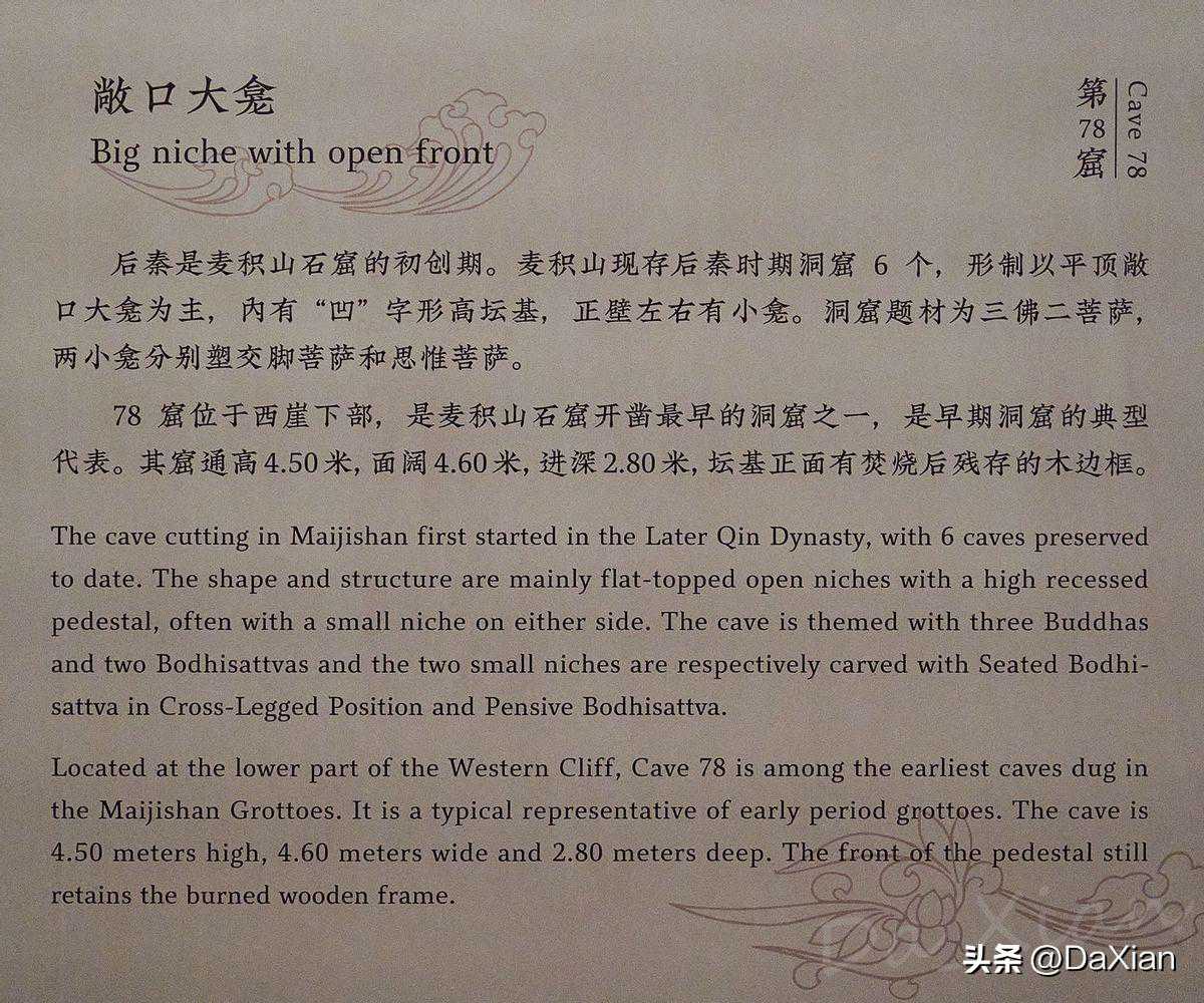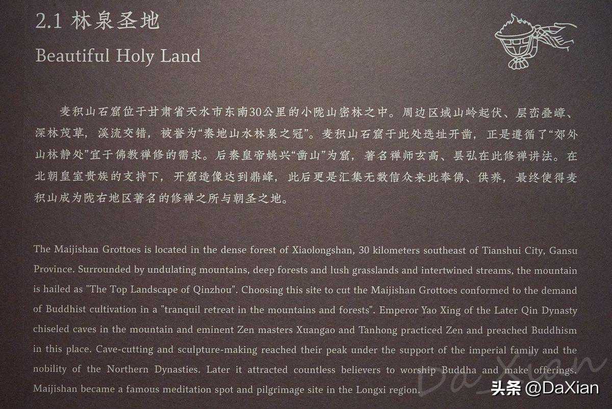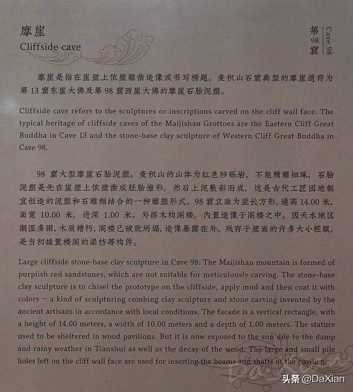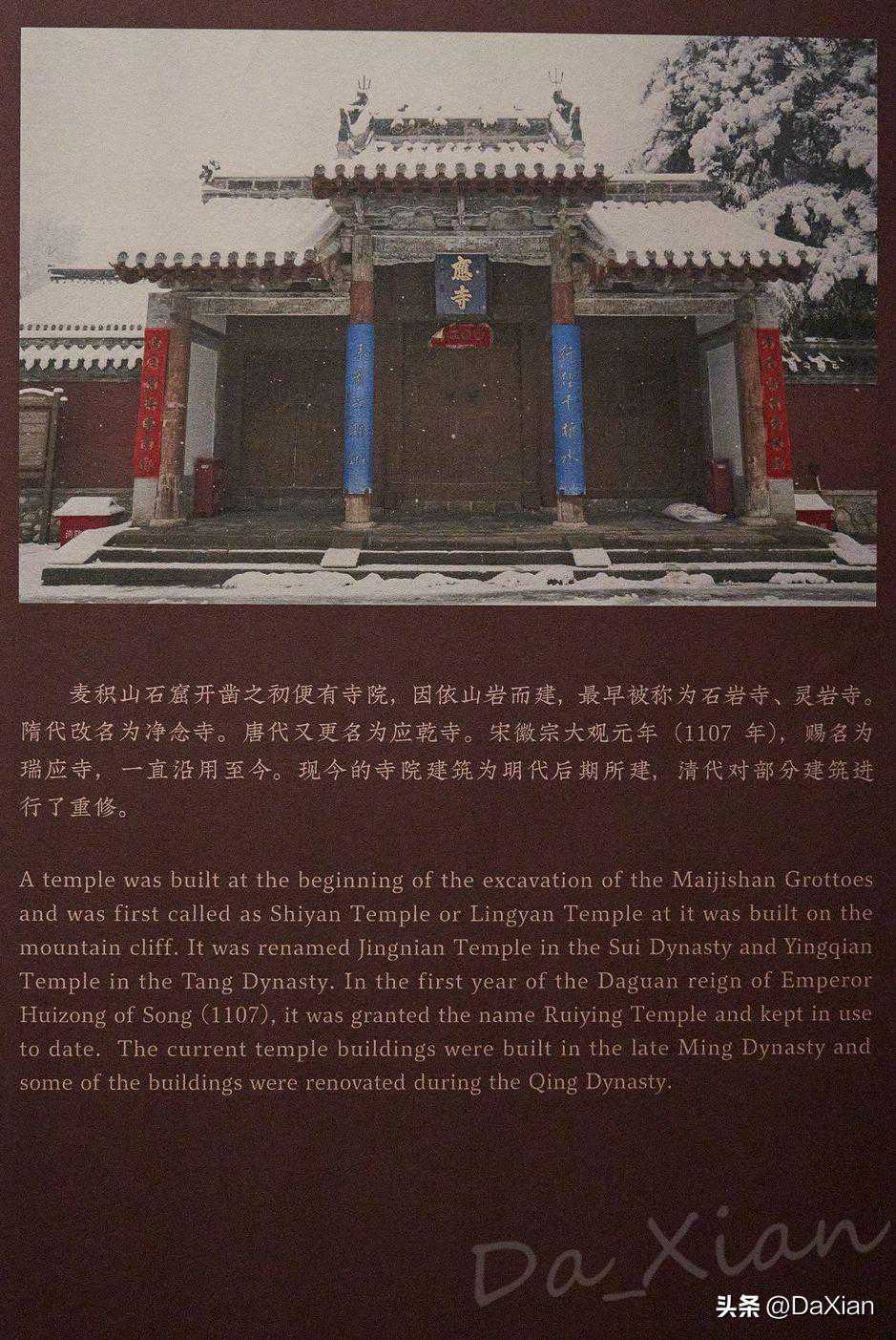 麦积山石窟作为5-13世纪佛教沿丝绸之路传播和发展的典型佛教石窟寺,是石窟遗存与地貌特征和自然景观完美结合的艺术杰作。其石窟遗存包含了佛教洞窟、瑞应寺、山顶舍利塔以及馆藏可移动文物等,是典型的文化遗产综合体。麦积山石窟的洞窟遗存全部开凿于东西长约120米、高80米的悬崖峭壁上,洞窟之间飞桥栈道相连。洞窟遗存包含雕塑、壁画、碑刻、题记等类型。题材众多,内容丰富。
