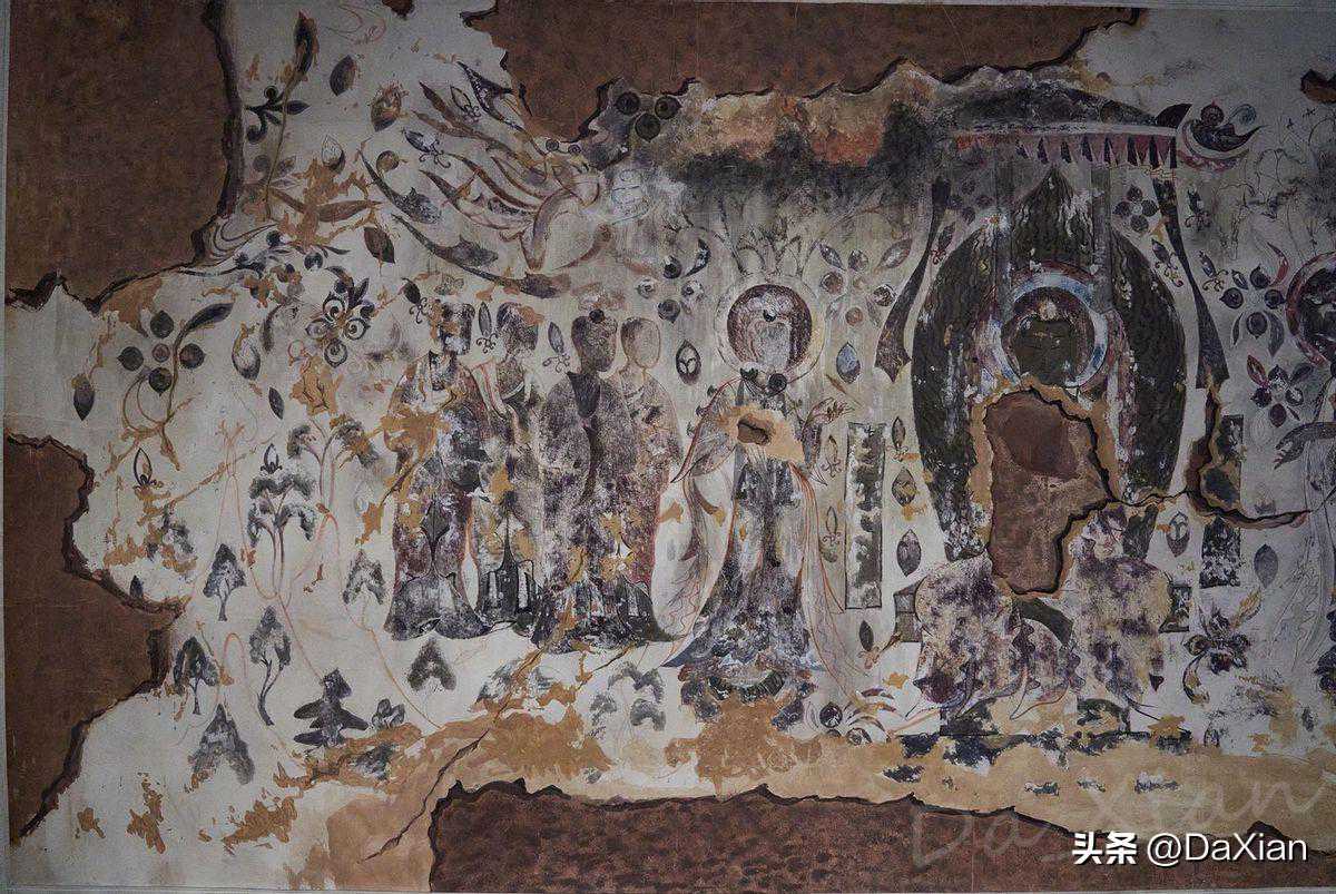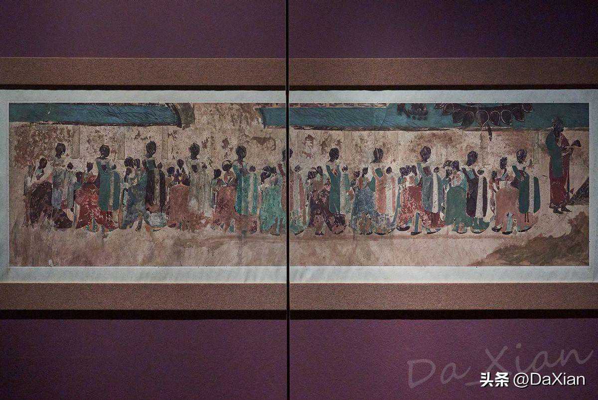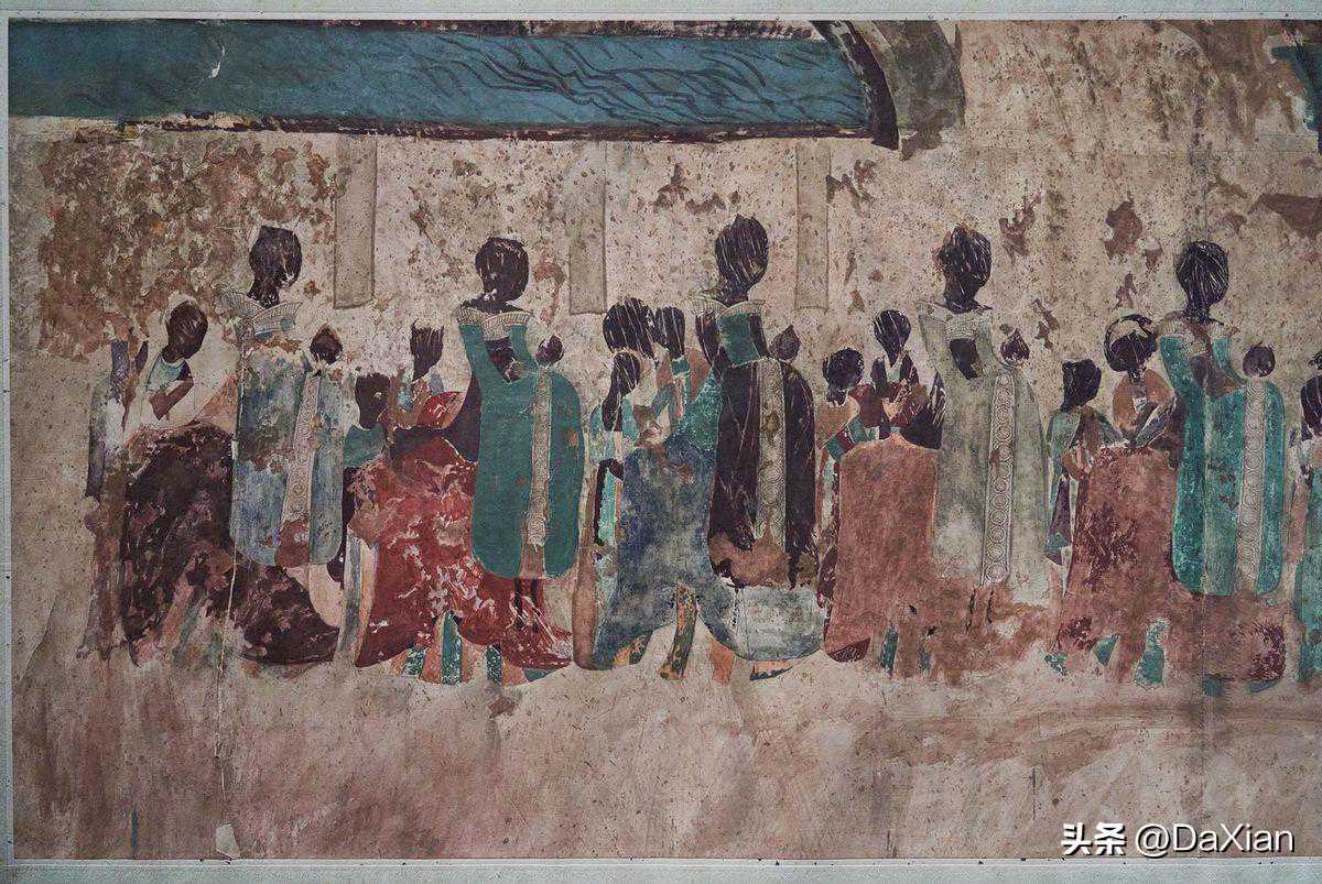 此画面为隋代供养人像,共计11组,一组三人。均束高发髻、面型清秀、身躯修长。最前方供养人上着圆领宽袖衫,下着宽博长裙,双手持莲蒂,向佛恭立,身后有两侍女随从。展现出隋唐时期高贵典雅的贵妇气派。