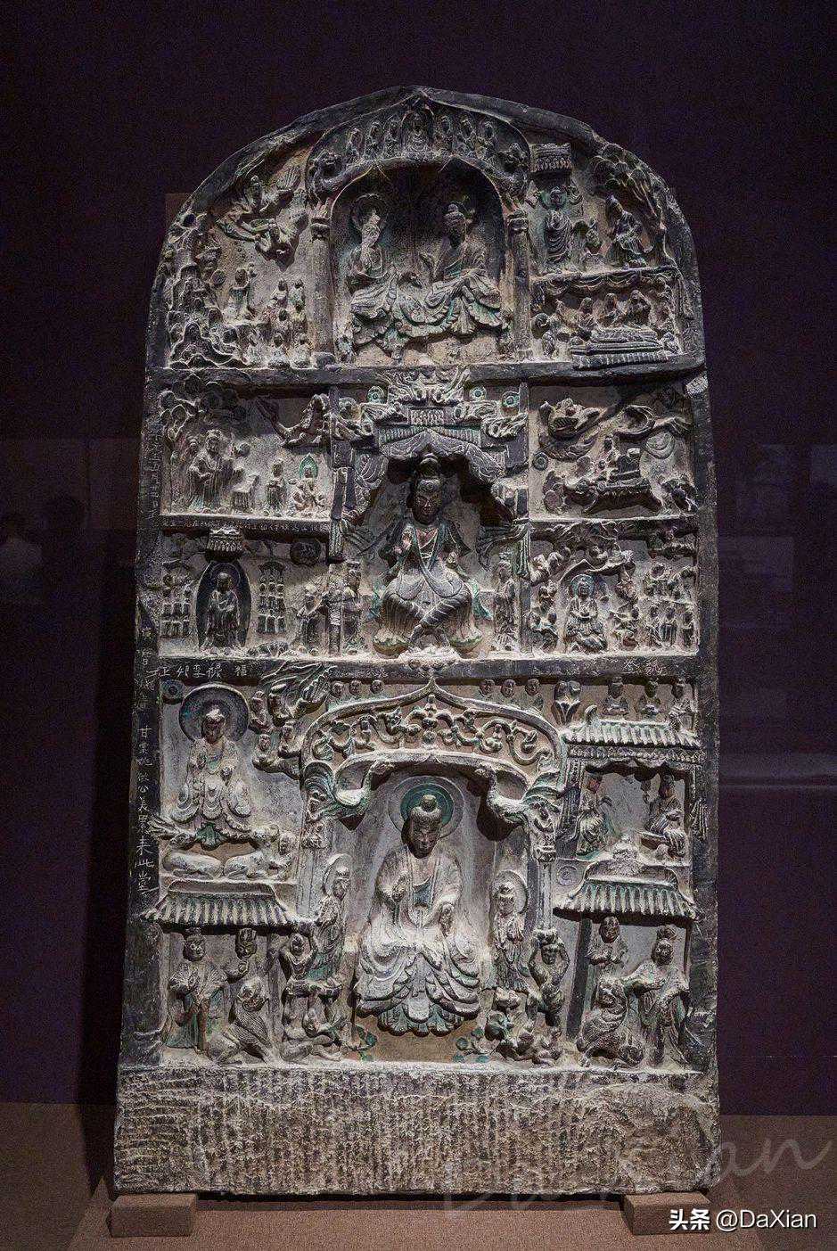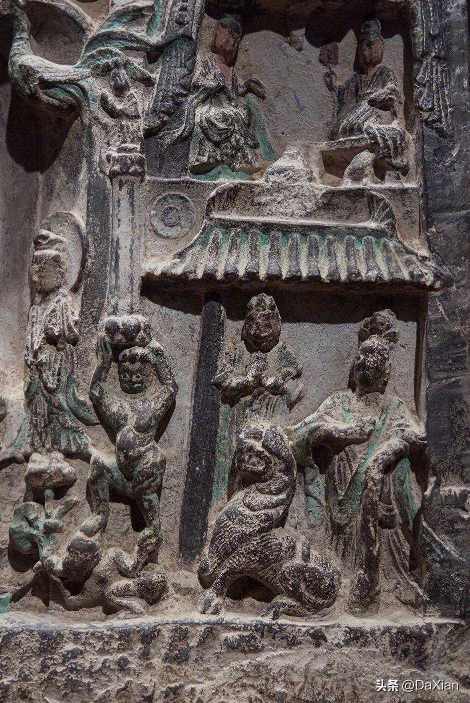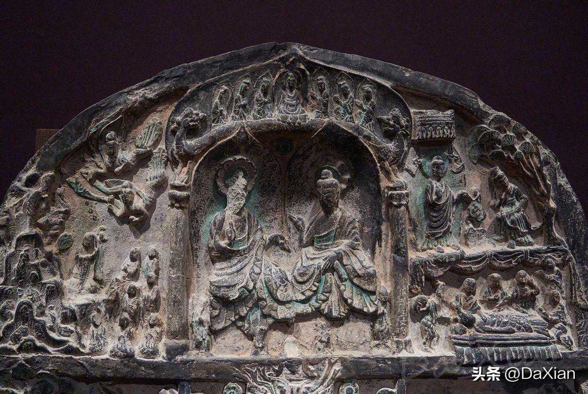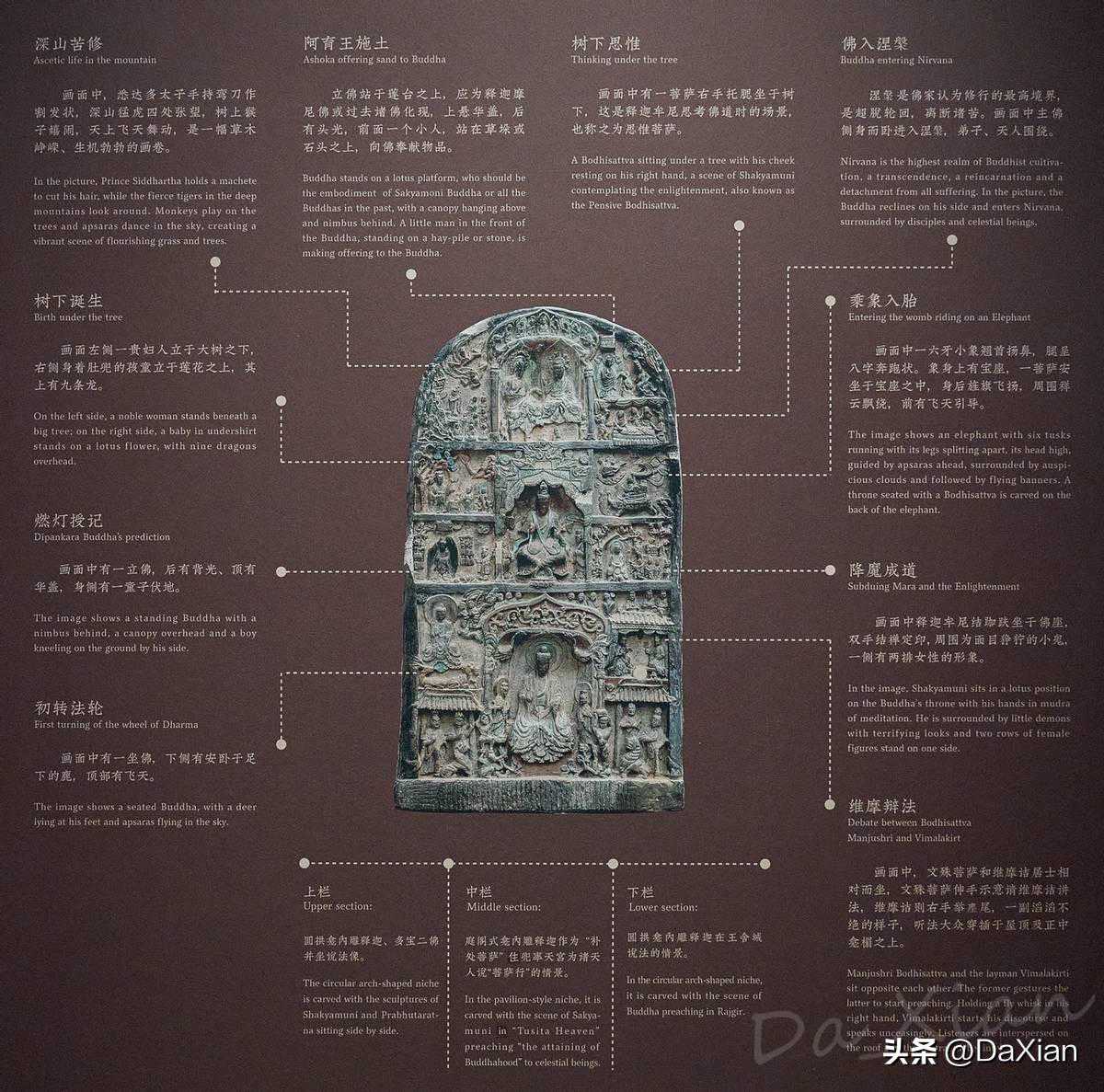 佛传故事碑碑头半圆形,中间断为两截,1985年拼粘在一起。正中的三个大格分别为释迦多宝并坐说法、交脚菩萨和释迦说法,两侧的小格分别是燃灯授记、乘象入胎、树下诞生、深山苦修、树下思惟、初转法轮、降魔成道、维摩辩法、阿育王施土、佛入涅樂等画面。形象生动地再显佛祖的一生。该碑雕刻工艺精湛,形象生动,堪称麦积山的“镇馆之宝”。