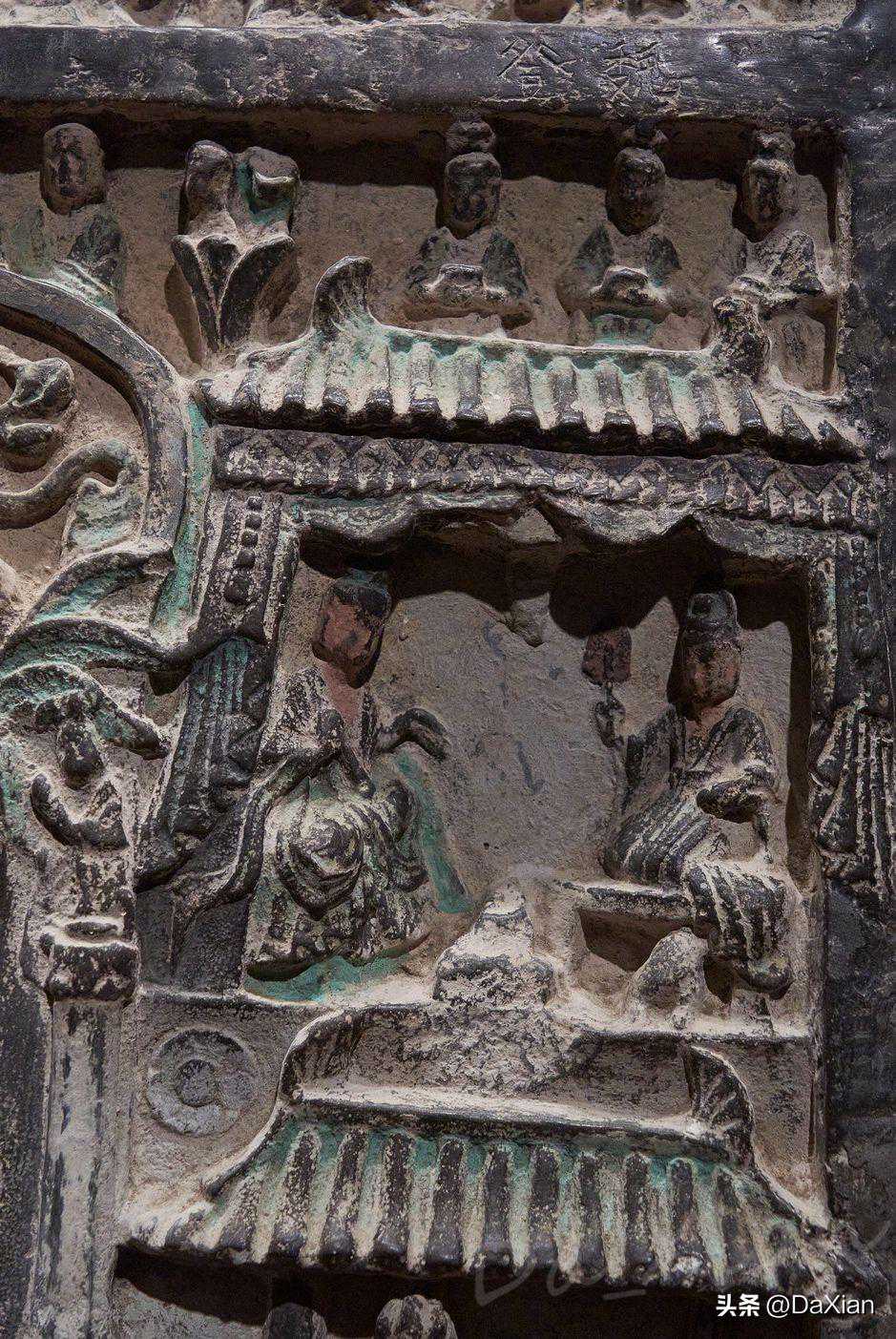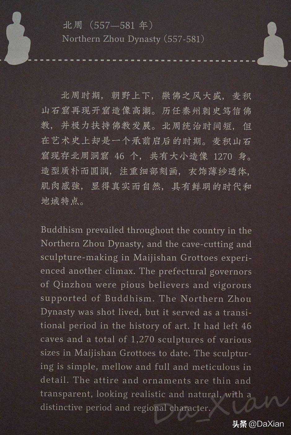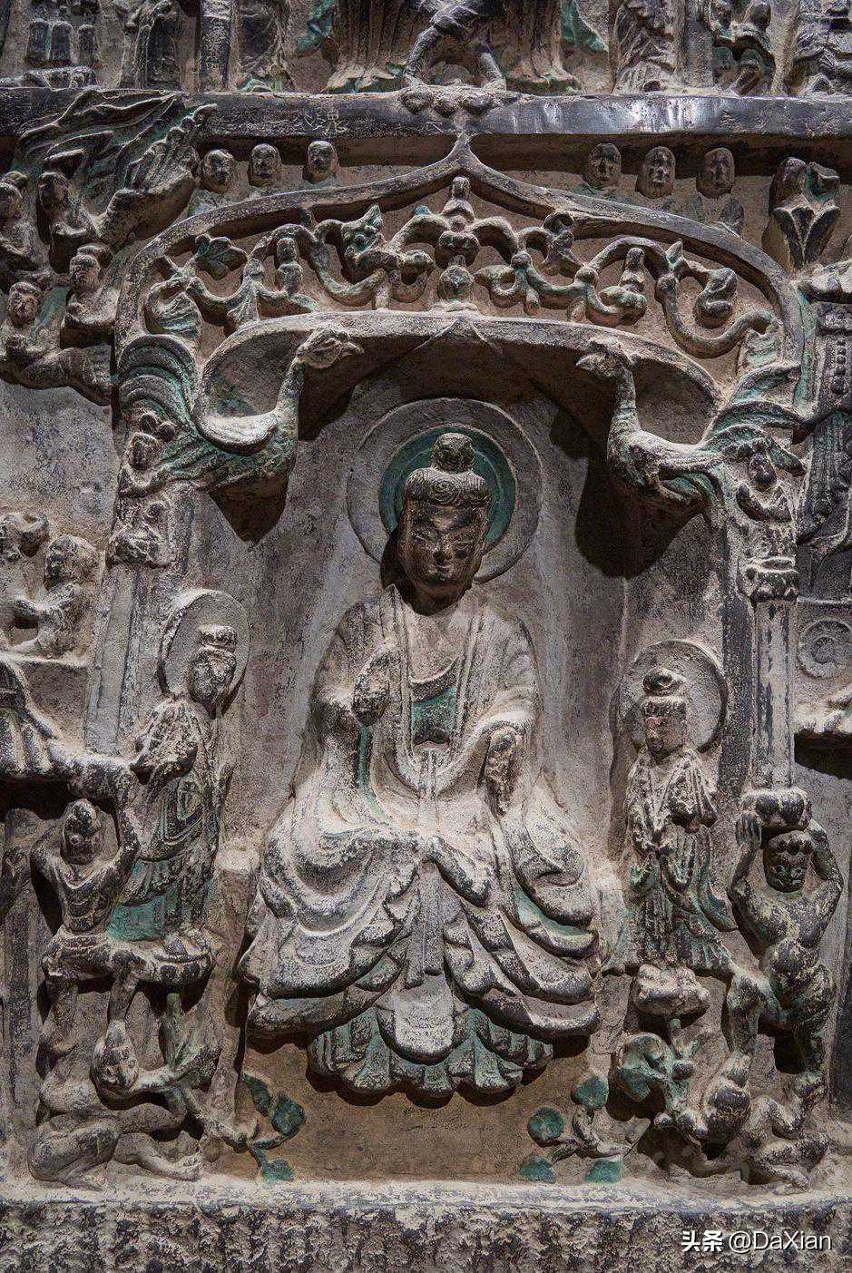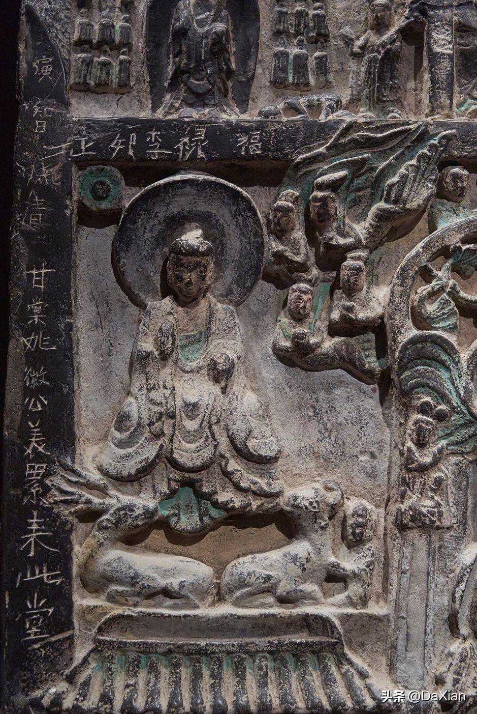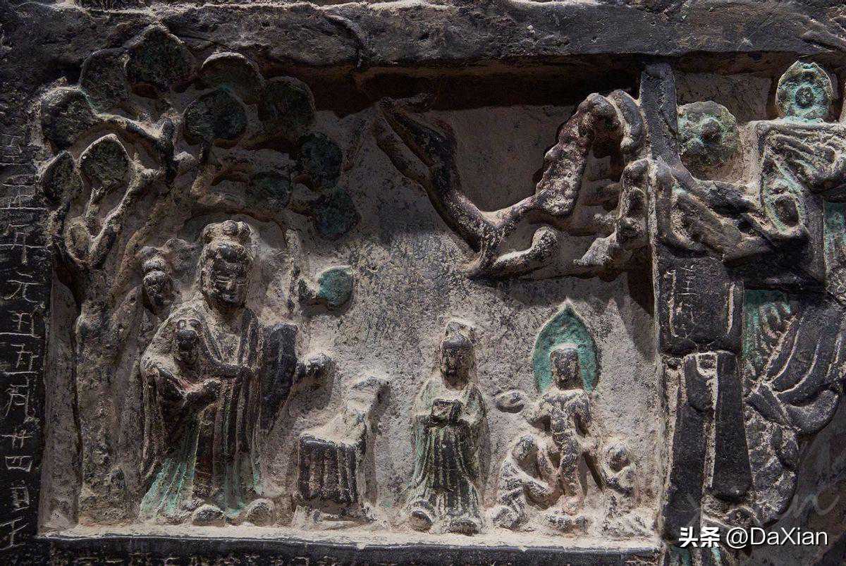 佛传故事碑碑头半圆形,中间断为两截,1985年拼粘在一起。正中的三个大格分别为释迦多宝并坐说法、交脚菩萨和释迦说法,两侧的小格分别是燃灯授记、乘象入胎、树下诞生、深山苦修、树下思惟、初转法轮、降魔成道、维摩辩法、阿育王施土、佛入涅樂等画面。形象生动地再显佛祖的一生。该碑雕刻工艺精湛,形象生动,堪称麦积山的“镇馆之宝”。