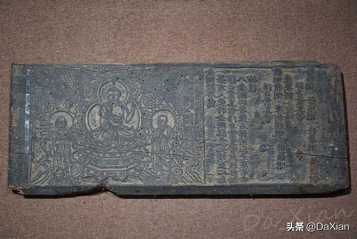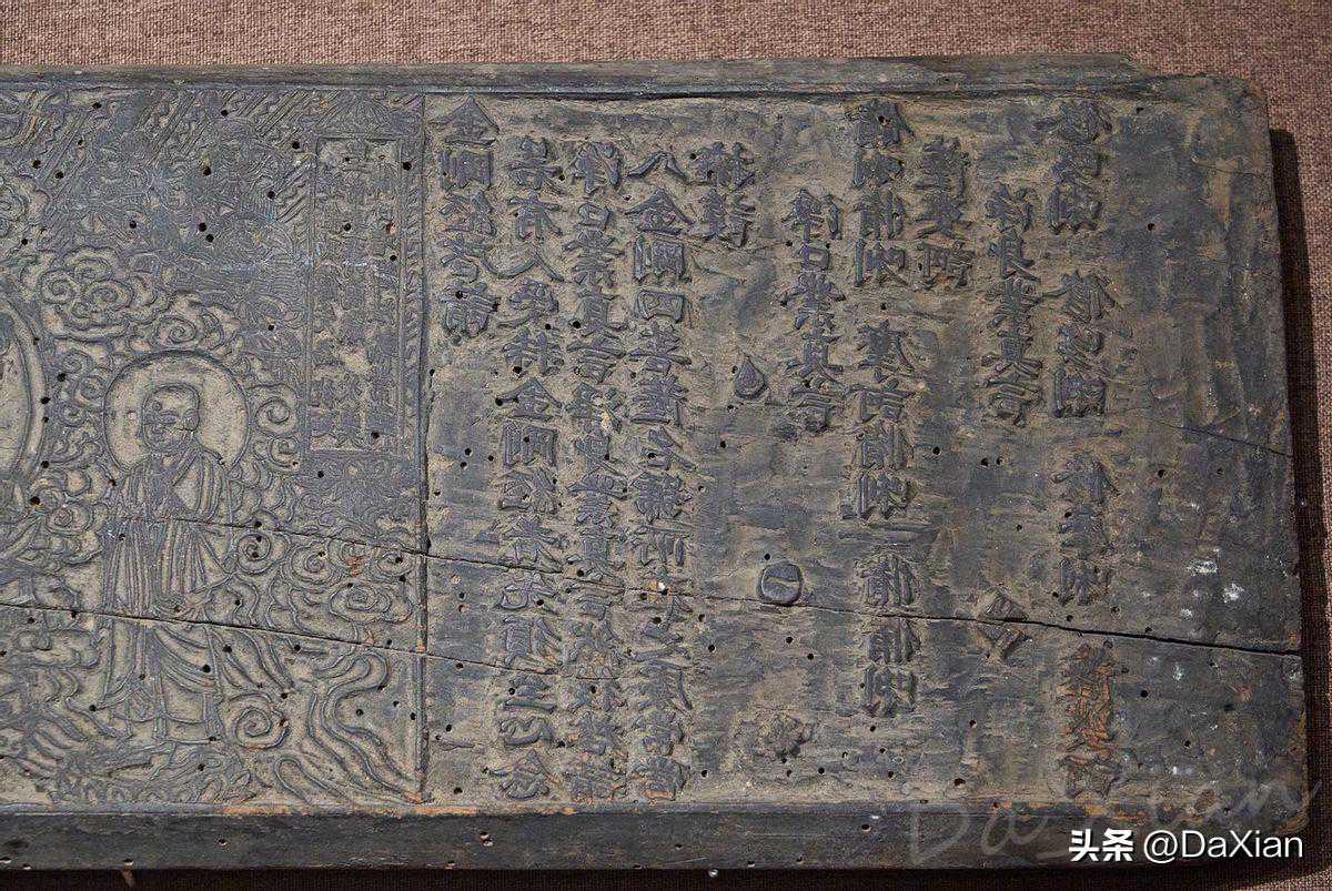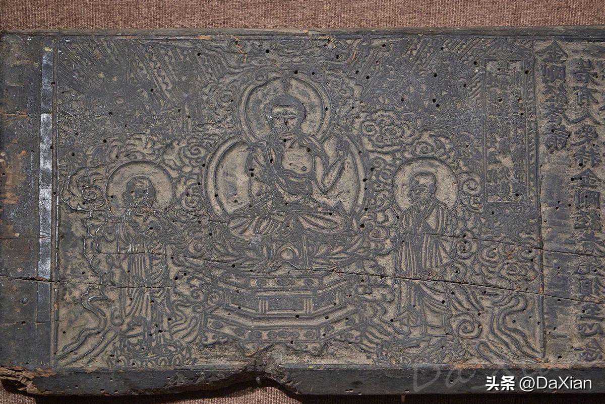 减地阳刻经板。正面左边雕一佛二弟子,后面有背光,周围祥云环绕,并有佛光呈四射状,两弟子头部上方各雕四身造像,似八部护法神,形态各异,手中均持法器;右边为《金刚经啓经》经文。