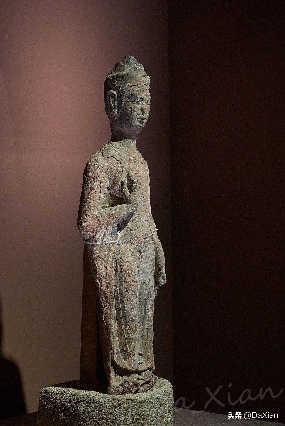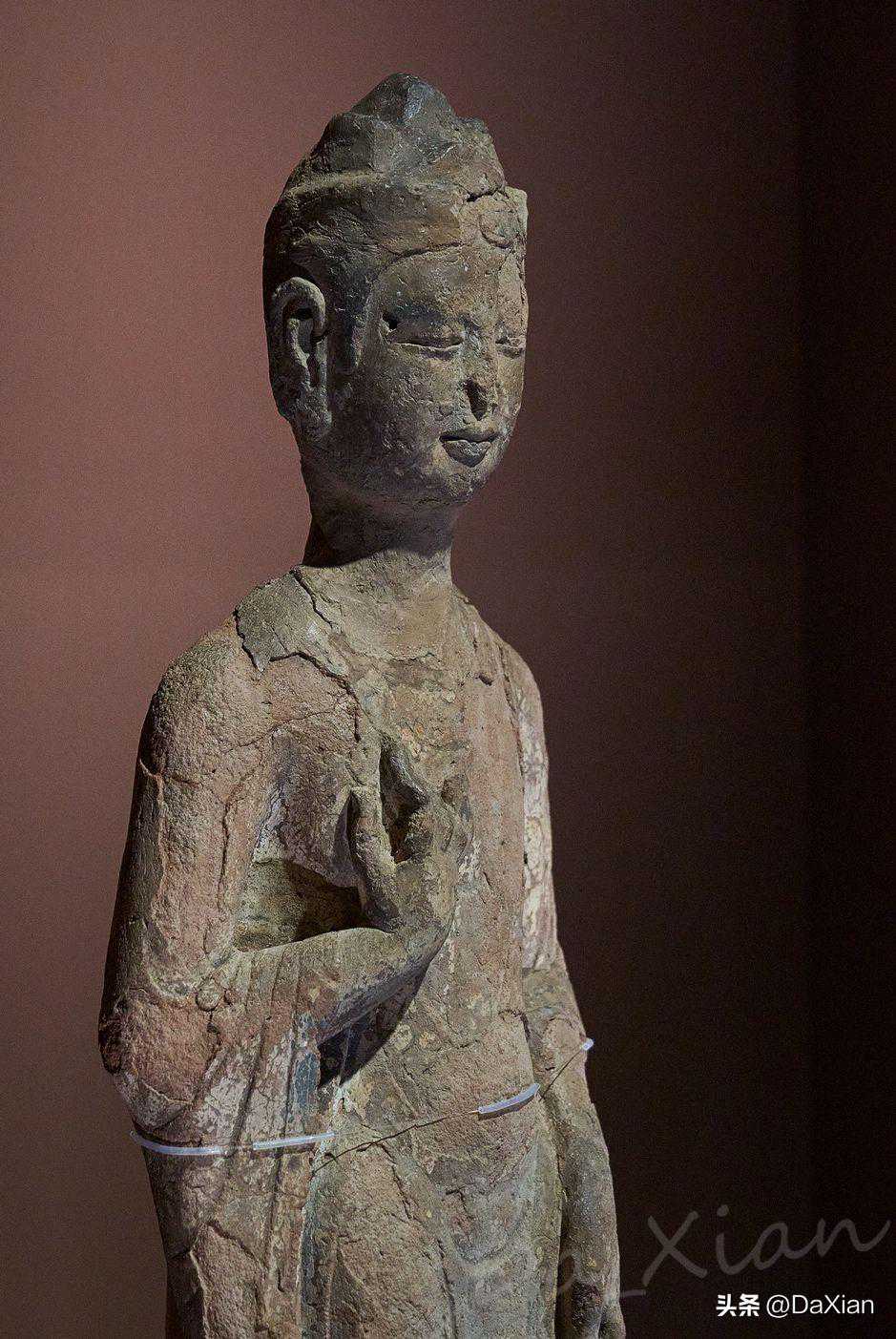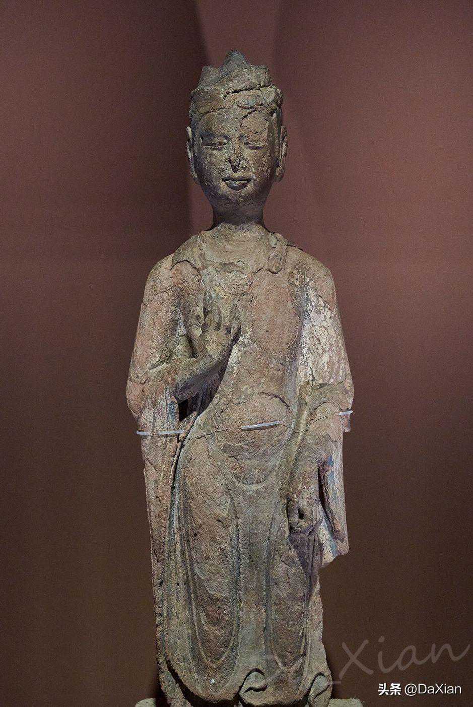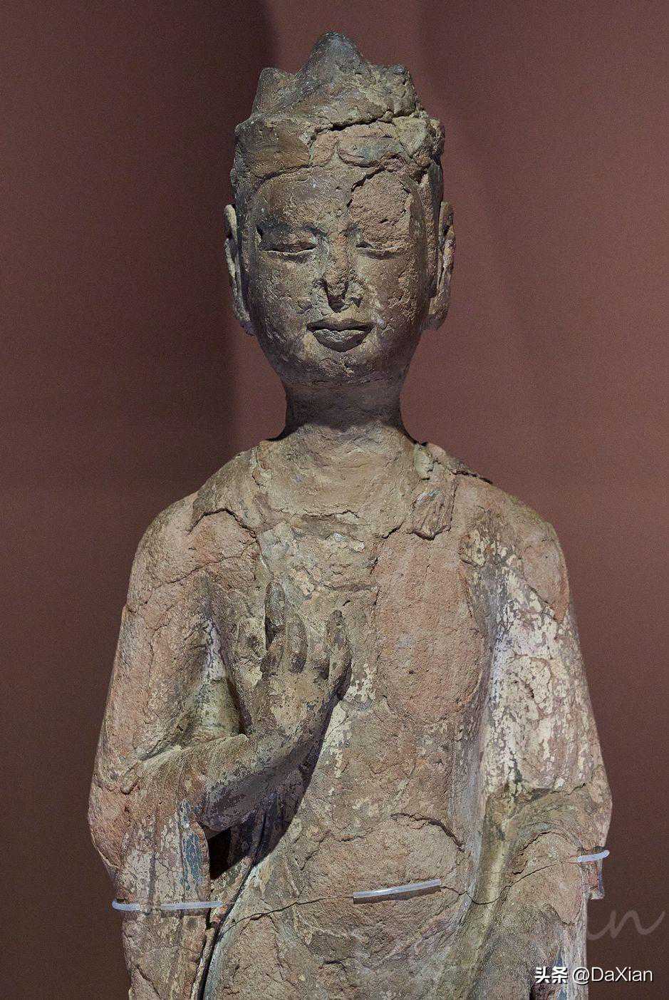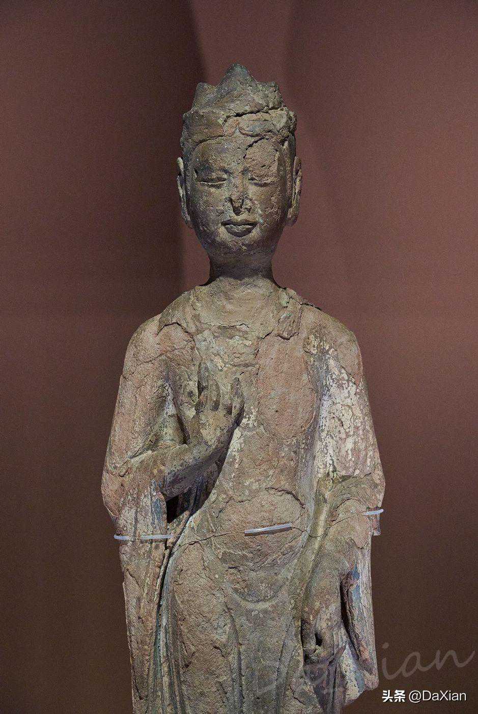 菩萨面型长方,宽额,直鼻,弯眉细目,嘴角内敛,下颌上翘。上着交领襦衫,下着长裙。右手臂弯曲抚于腹前,左臂屈肘轻贴于胸部。飘带自双肩下垂交叉于腹部。身躯微微扭动,体态优美。