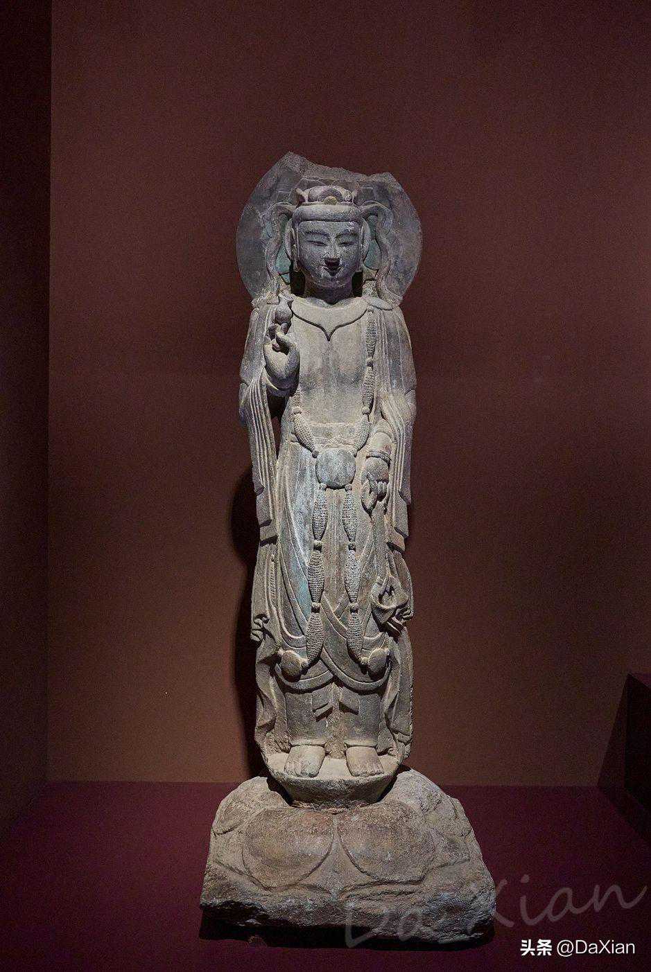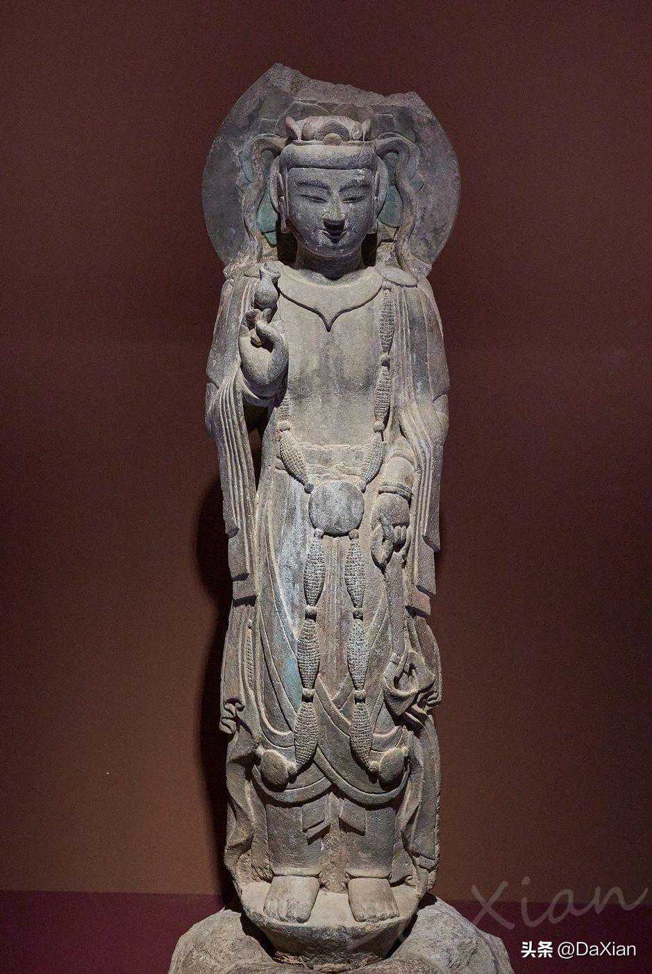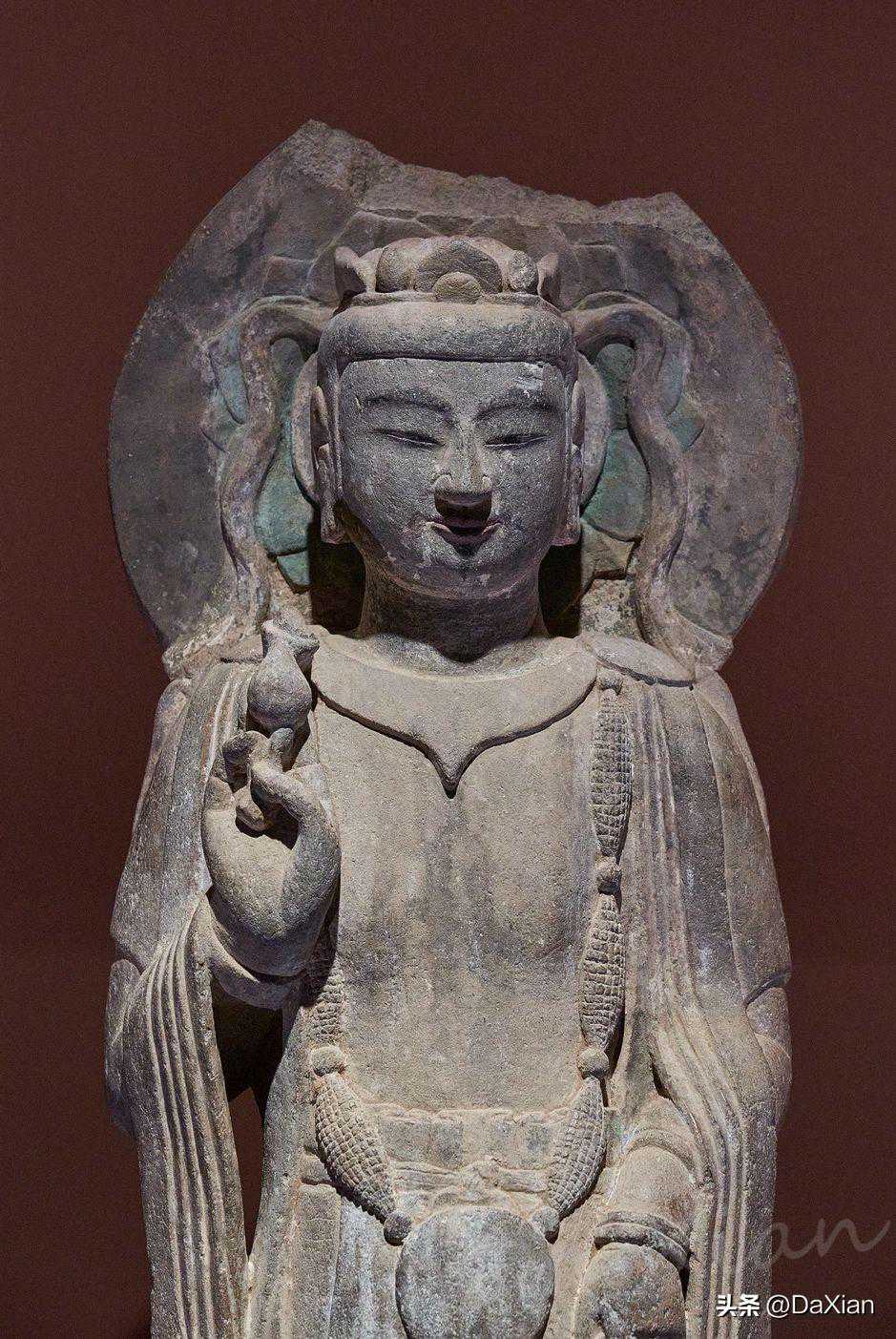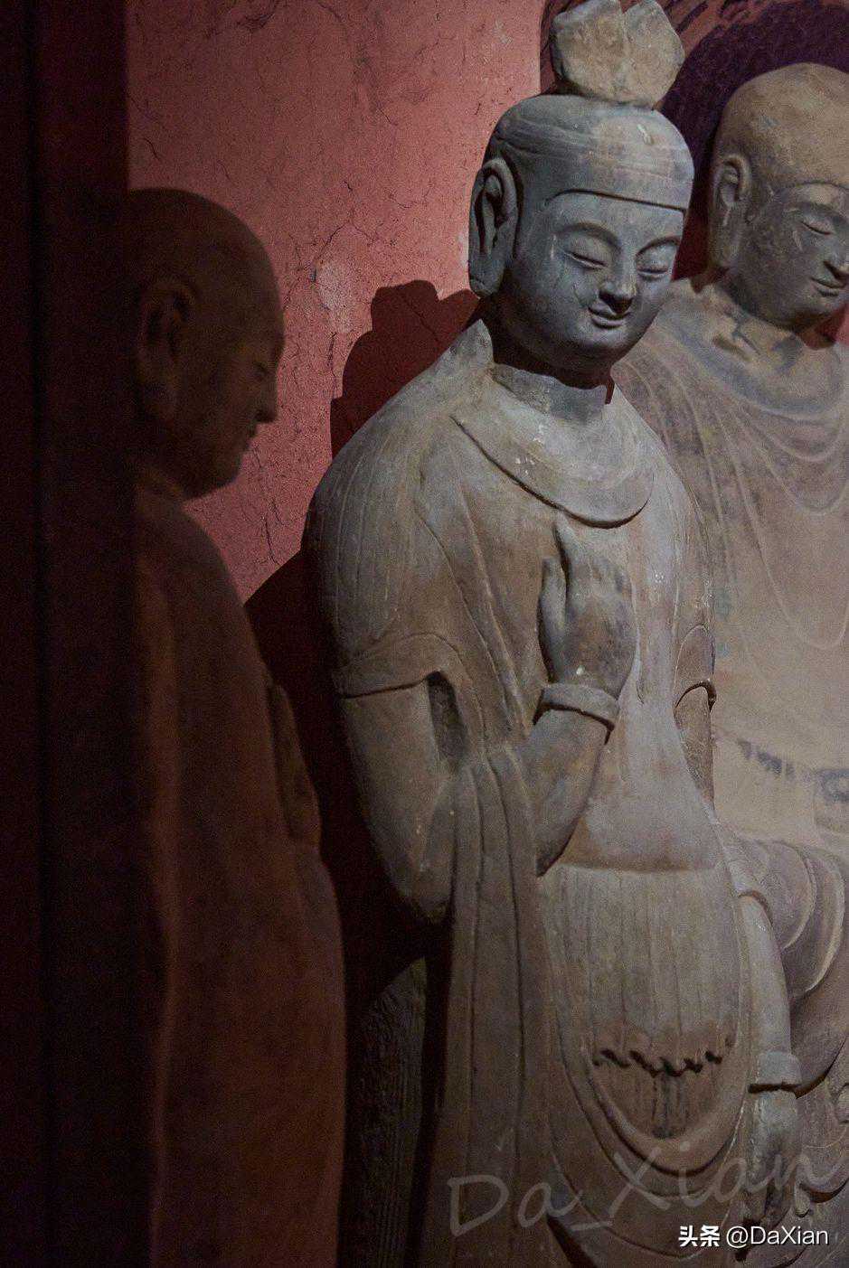菩萨面型长方,宽额,直鼻,弯眉细目,嘴角内敛,下颌上翘。上着交领襦衫,下着长裙。右手臂弯曲抚于腹前,左臂屈肘轻贴于胸部。飘带自双肩下垂交叉于腹部。身躯微微扭动,体态优美。