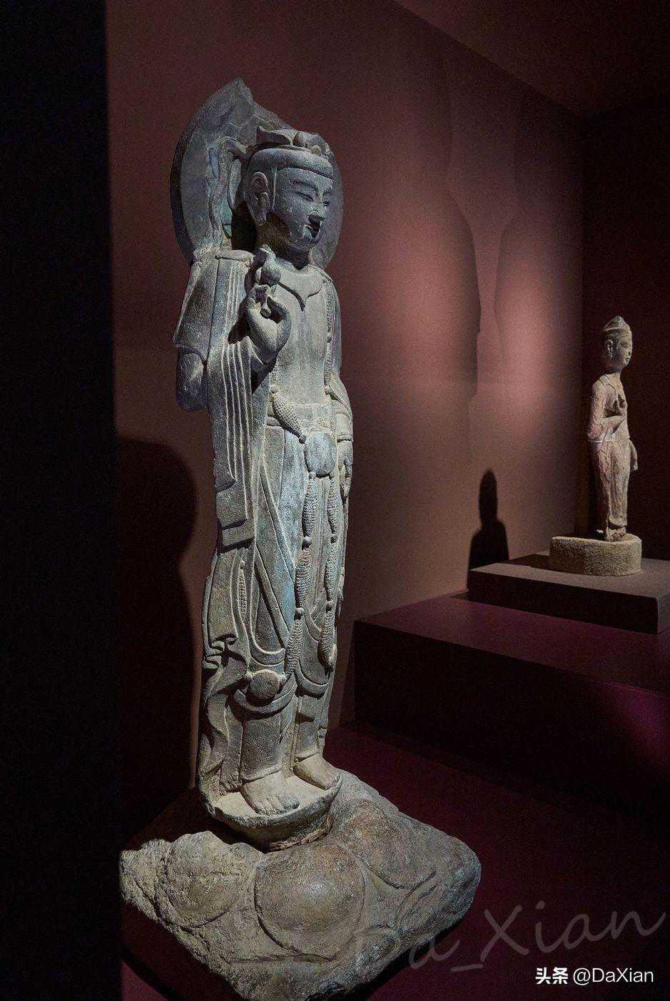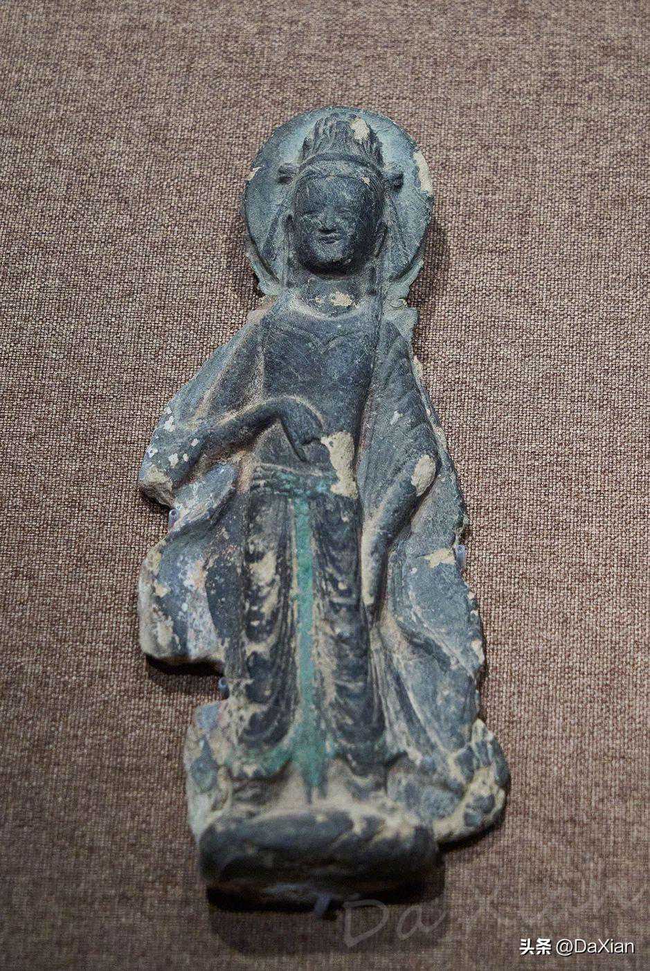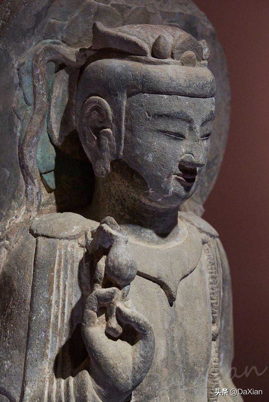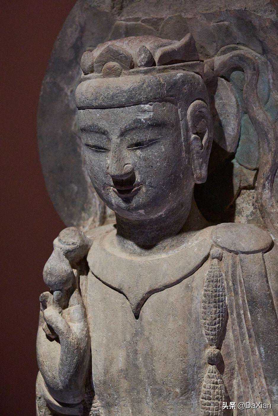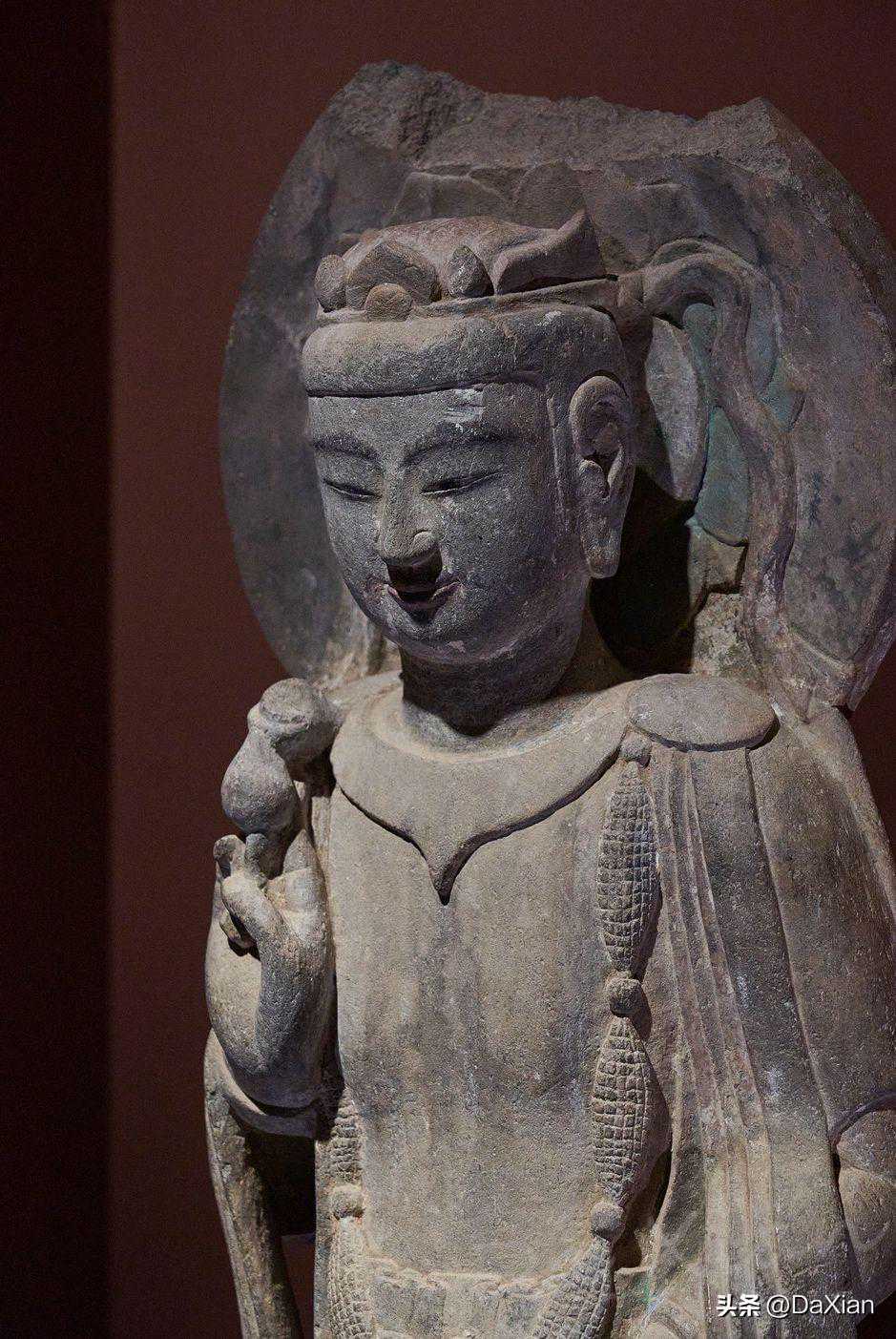 菩萨面型长方,宽额,直鼻,弯眉细目,嘴角内敛,下颌上翘。上着交领襦衫,下着长裙。右手臂弯曲抚于腹前,左臂屈肘轻贴于胸部。飘带自双肩下垂交叉于腹部。身躯微微扭动,体态优美。