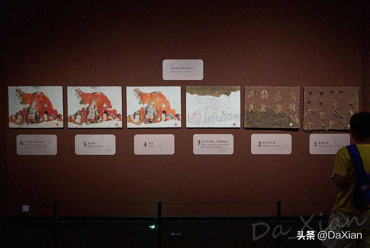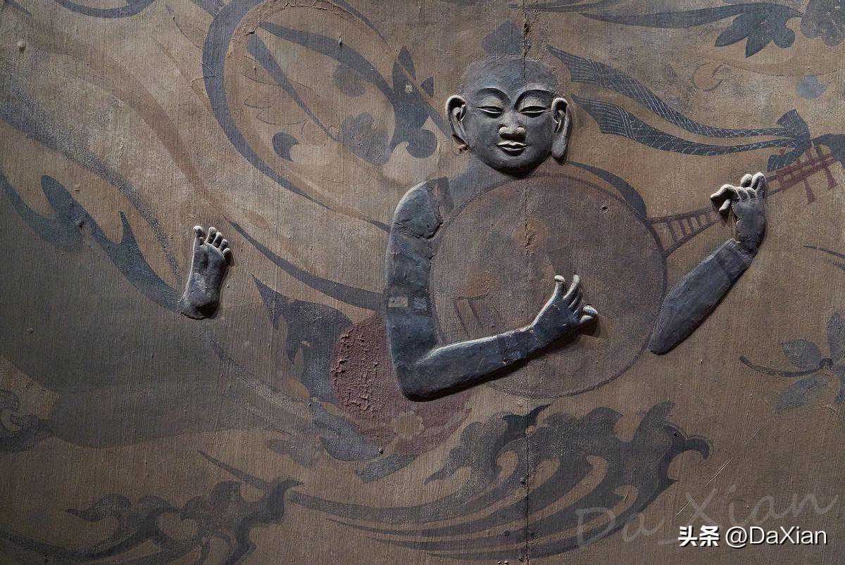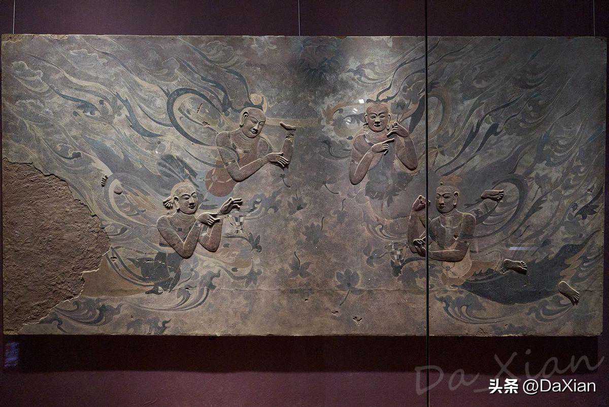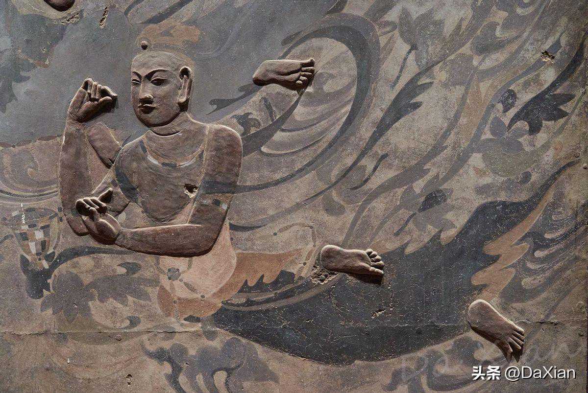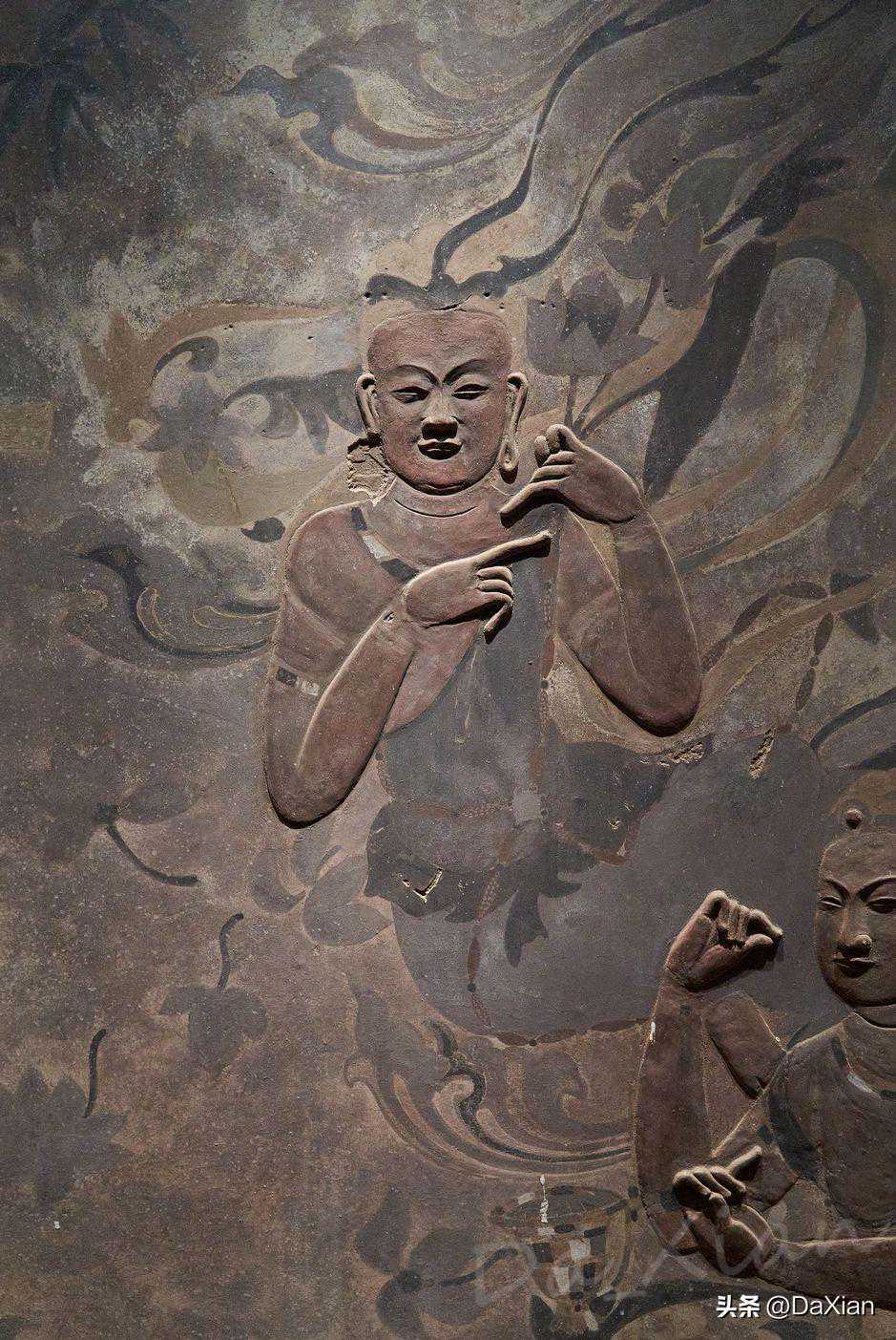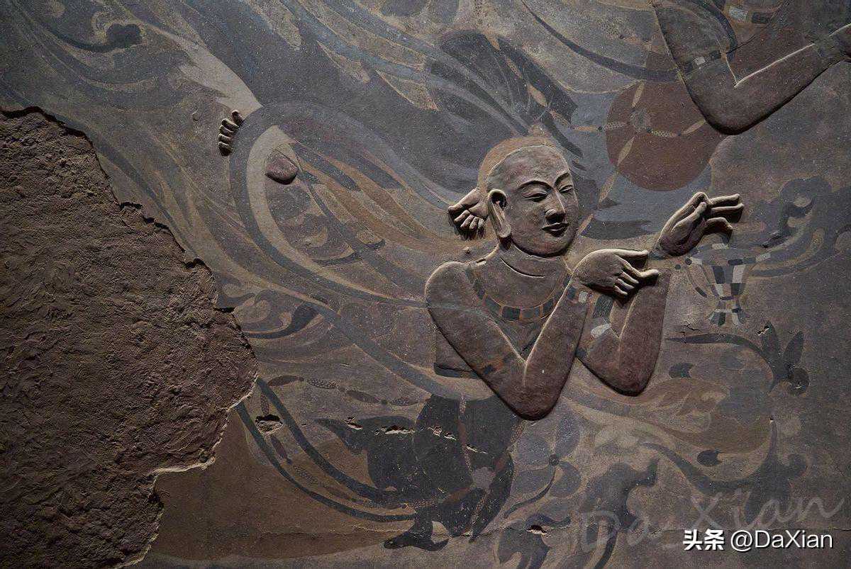 飞天身体用细泥浮塑而成,衣裙、飘带、冠饰及四周的流云、飞花等以绘画的手法表现。浮塑极薄,立体效果毕具飞天形象有脱壁欲出的感觉。
