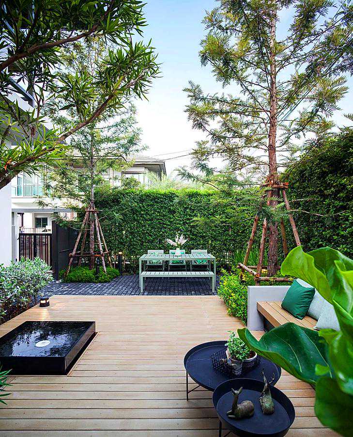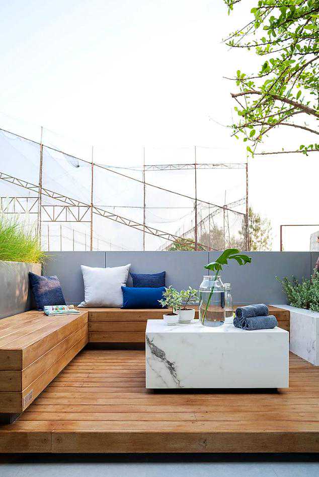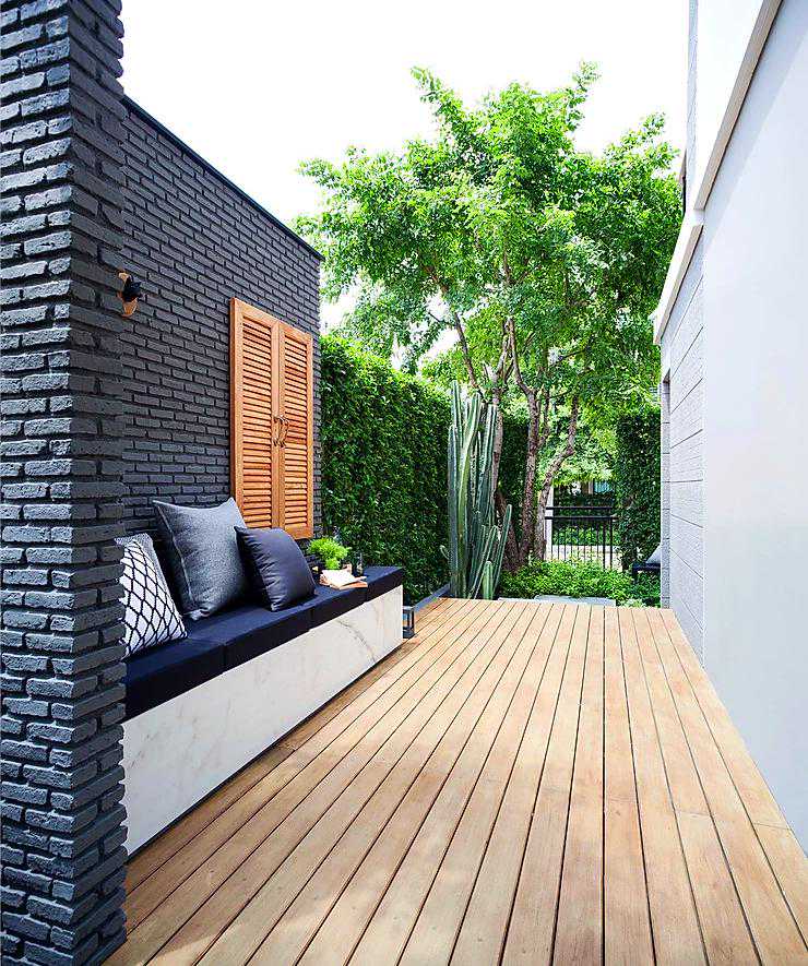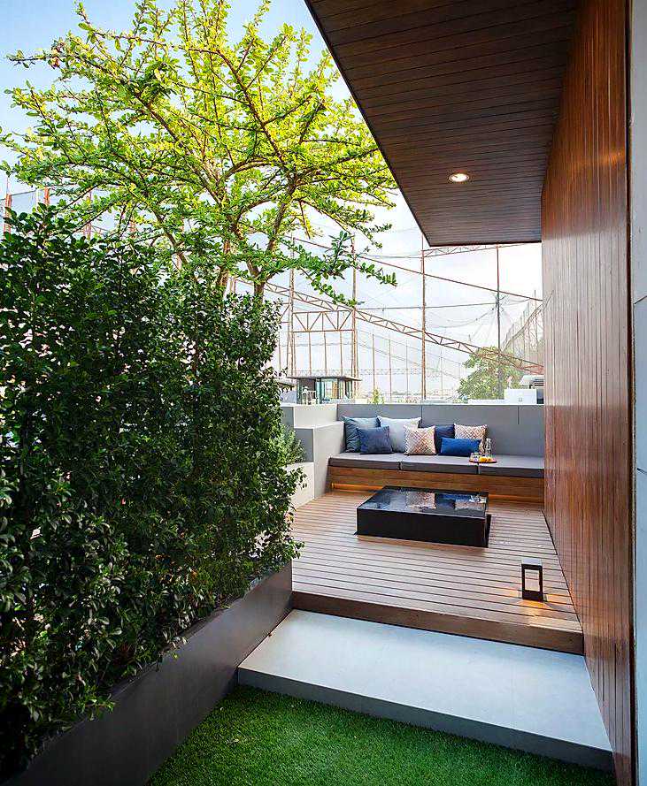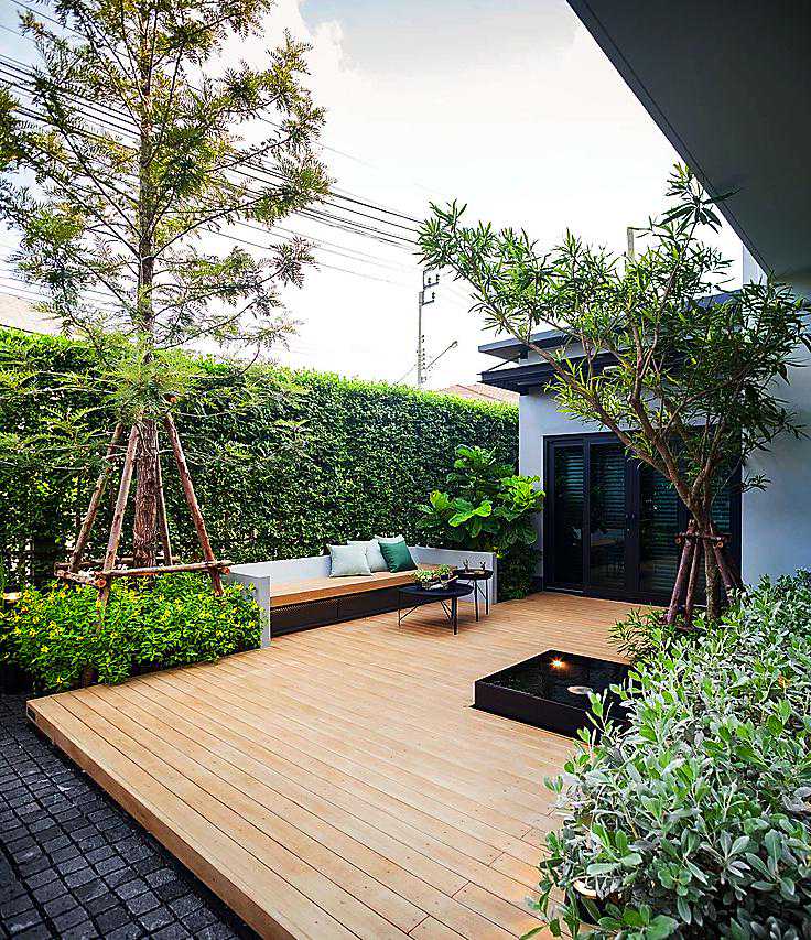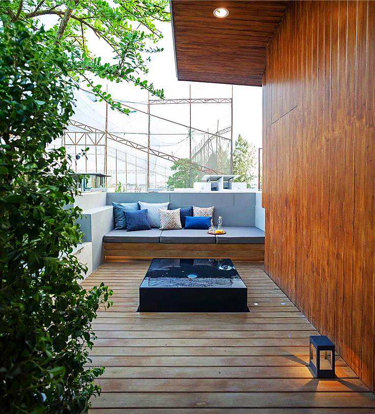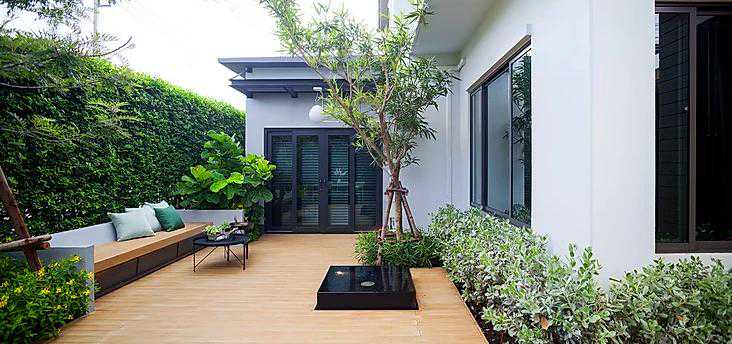这个案例用防腐木做了地面和休息椅,再也不用为刮风下雨而担忧了,可以无忧的享受庭院花园带来的自然生活