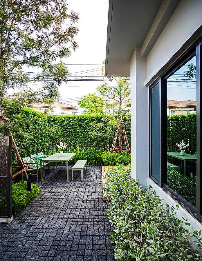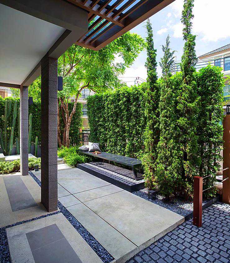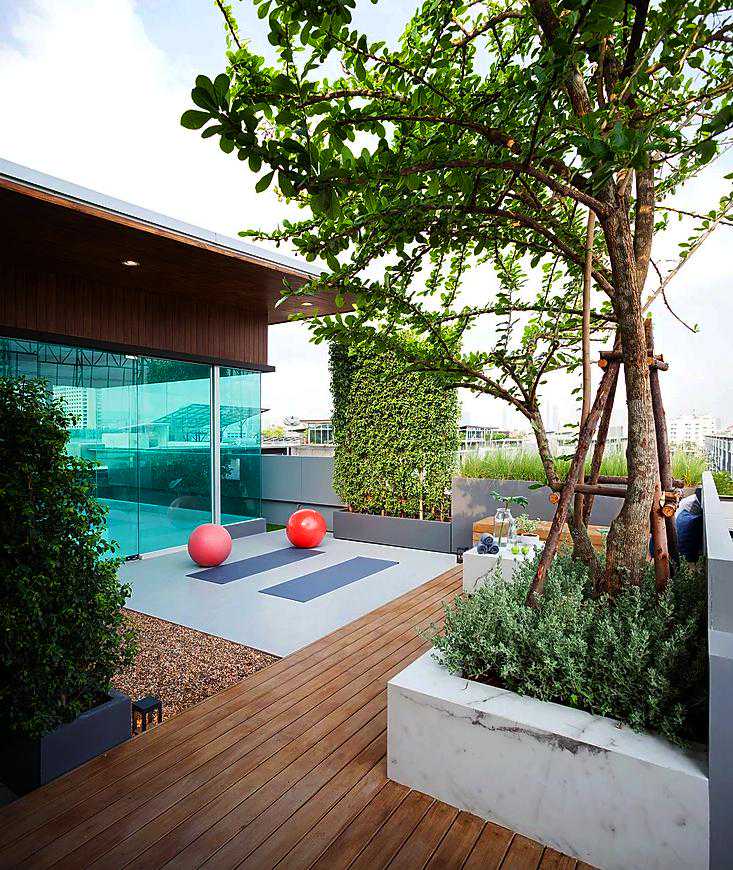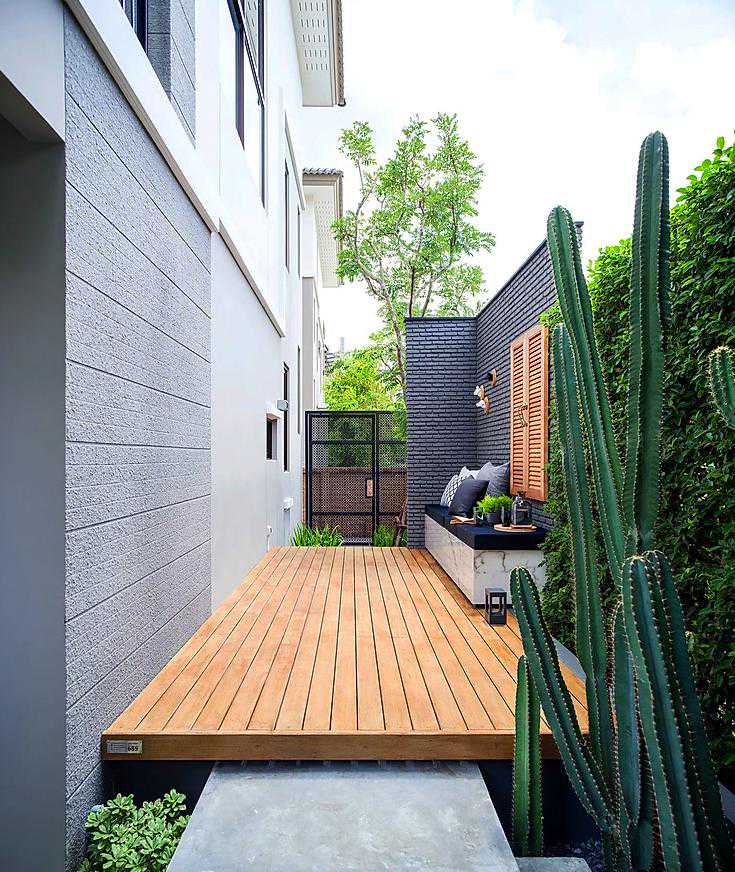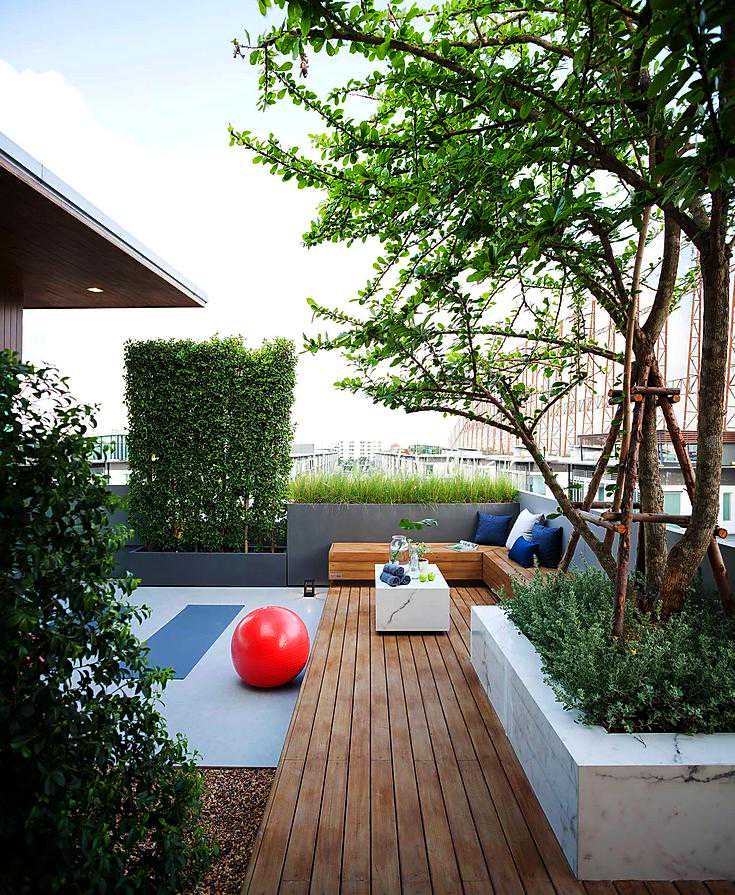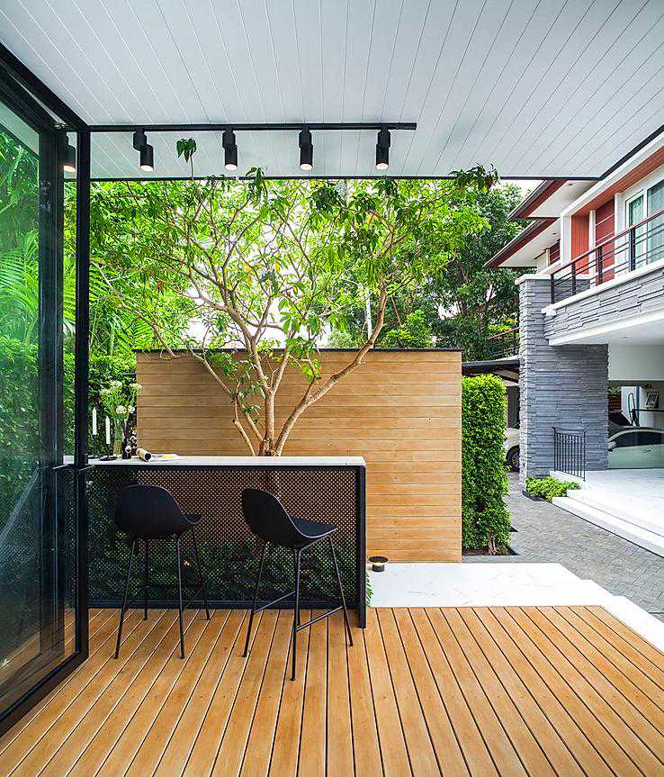 这个案例用防腐木做了地面和休息椅,再也不用为刮风下雨而担忧了,可以无忧的享受庭院花园带来的自然生活