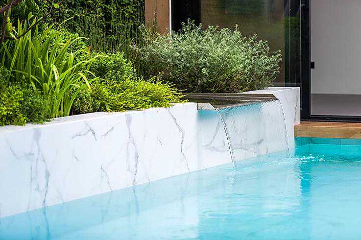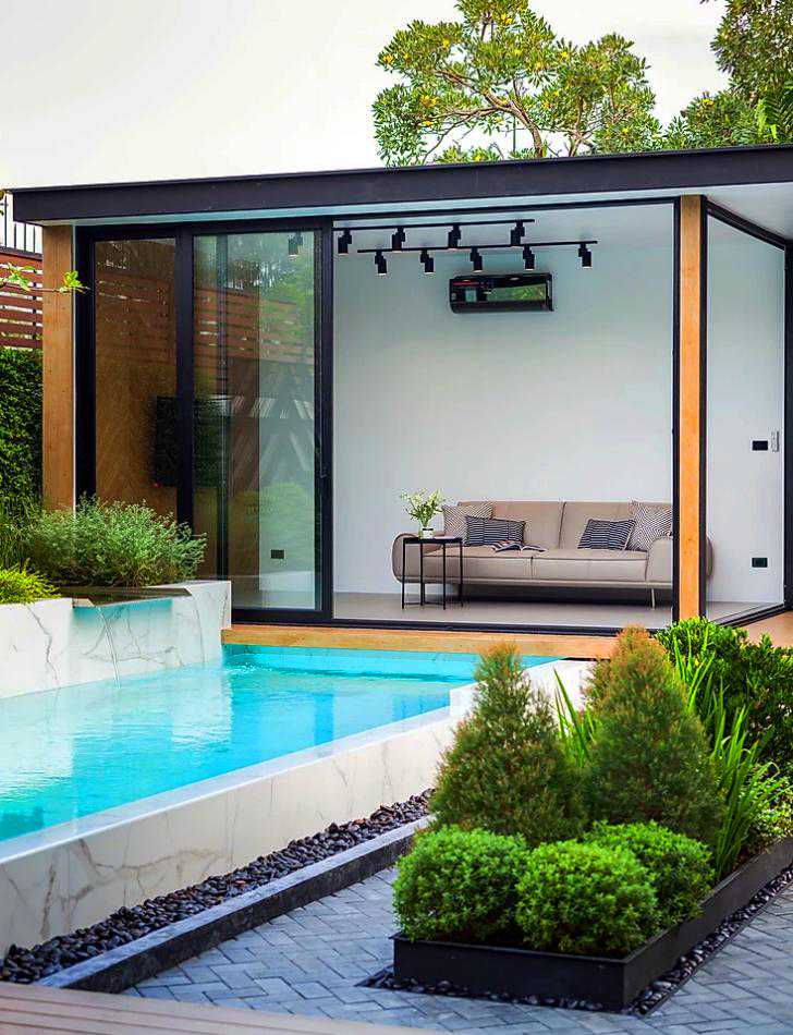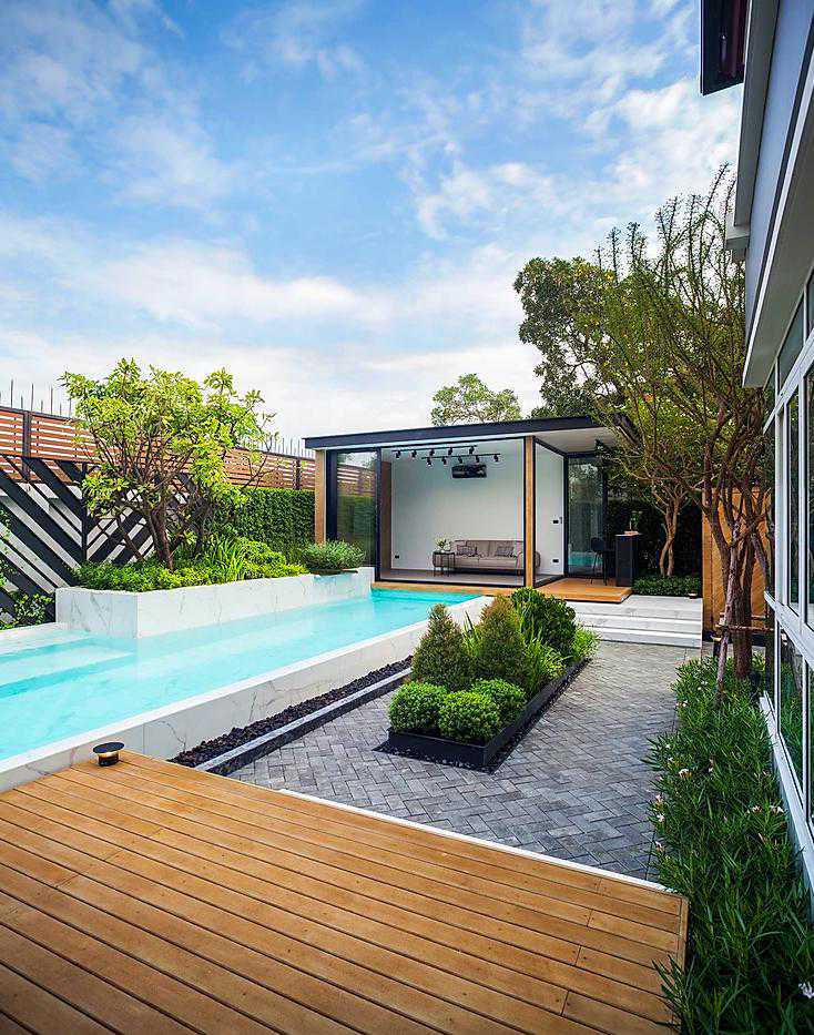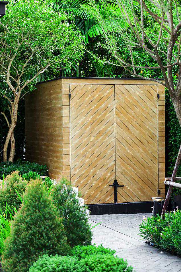 这是一个有泳池的小花园,用防腐木做了地台,还用防腐木装饰了电箱,黄黄的木色与庭院中的绿植相结合,色彩搭配非常好看