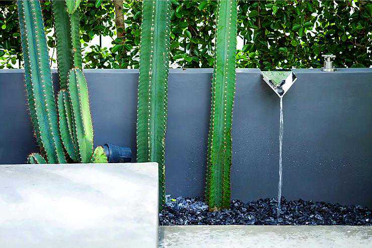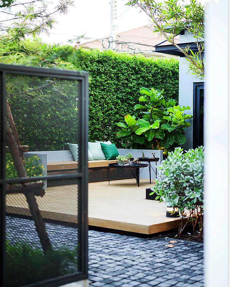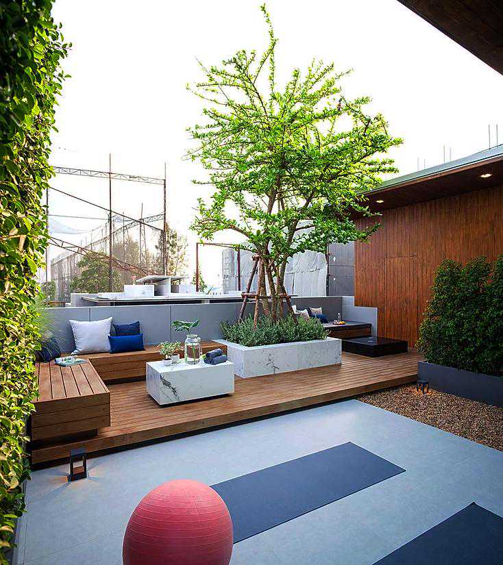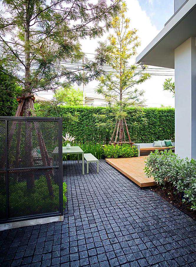 这个案例用防腐木做了地台,木色的地台与灰色马蹄石搭配组合成地面铺装,真的是最佳色彩搭档