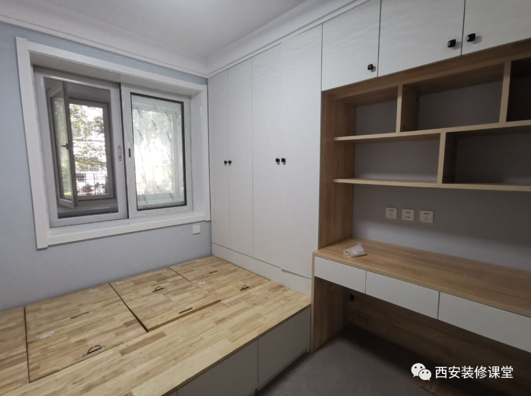 ▲橡胶木定制榻榻米也是一个道理,如果是儿童房为了环保,柜体都采用橡胶木,柜门都采用肤感吸塑系列。上方难看的指接板后期盖住以后是看不到的,既保证颜值,又能解决污染问题。