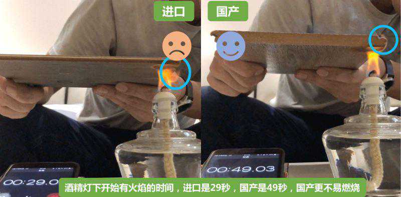 答:国产地板49秒之后才开始燃烧,而进口地板29秒出现火苗,单从这个维度上看,国产地板表现更好,安全系数更高。