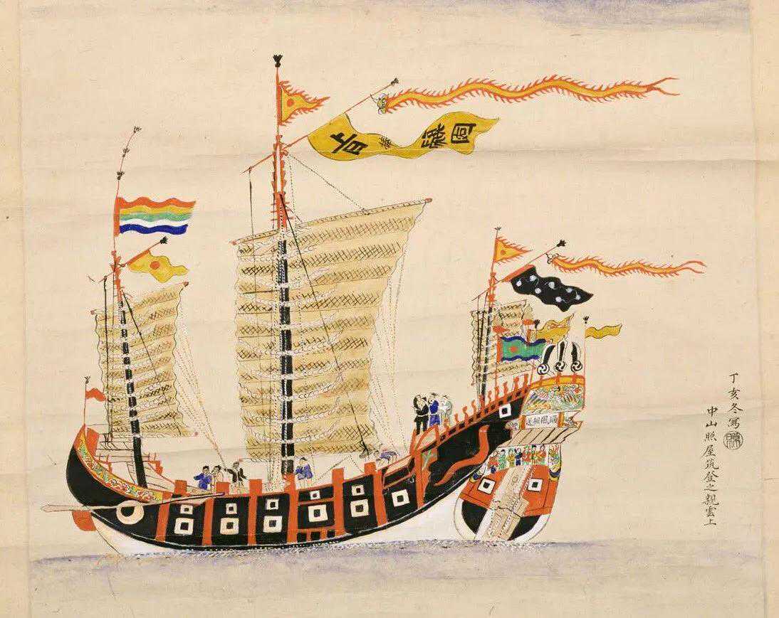 三是琉球帆船的历史画。注意船上的旗帜。使用了多面旗帜,但其中一面与现代日本使用的日の丸非常相似。其实这个设计本来是琉球的,但是日本偷走了。当然,由于日本的诸多罪行,这面旗帜已经被玷污,所以虽然琉球历史上曾使用过这面旗帜,但由于日本的负面内涵,已经不能再使用了。