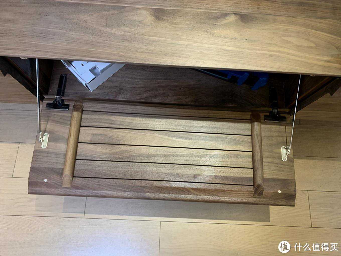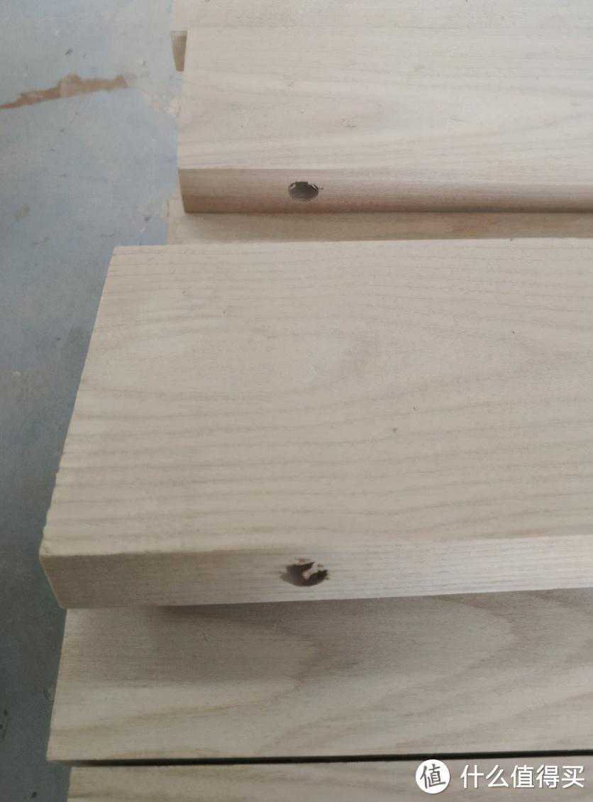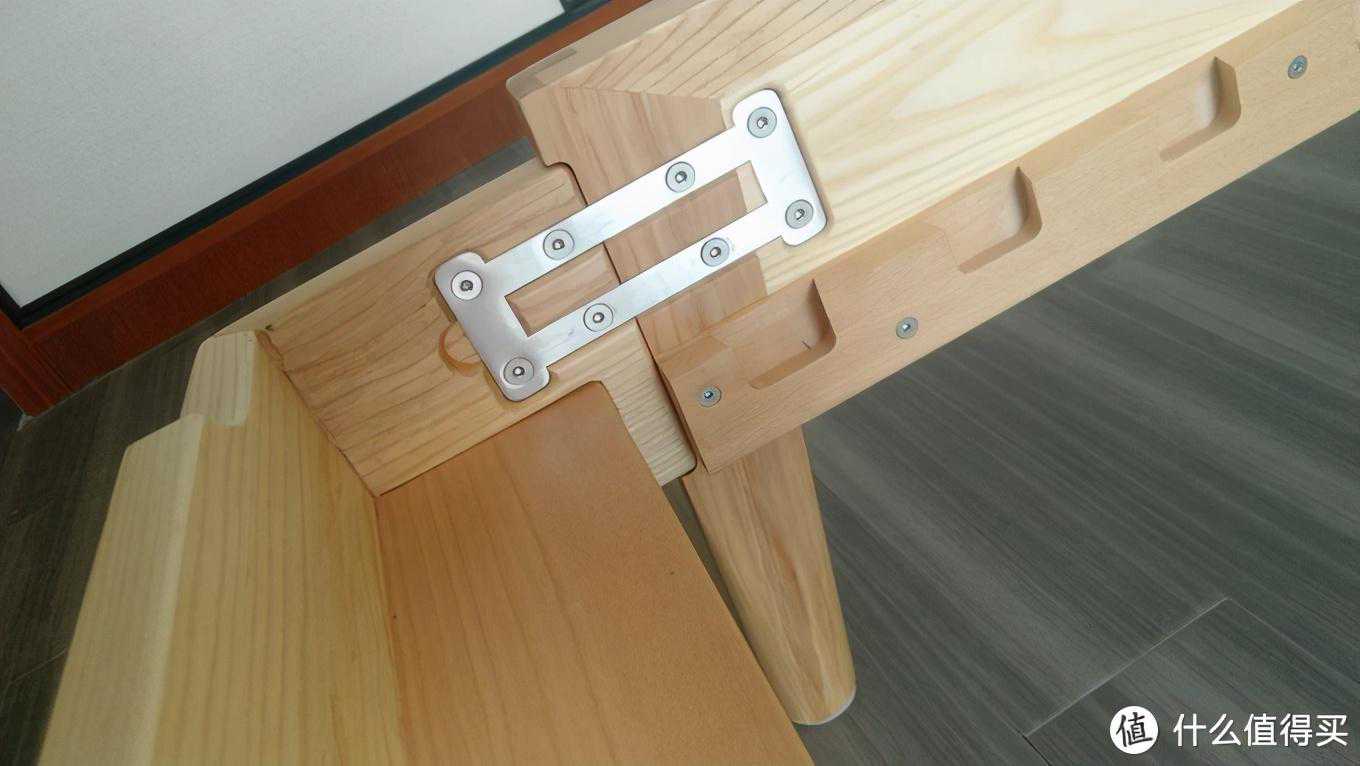 比三大家桌子强的地方在于,这张桌子的桌面在制作时使用了了简易版本的内穿带加固工艺,桌子面板内部打了贯穿孔,然后里面镶嵌了整根木条,从外面看不出来。