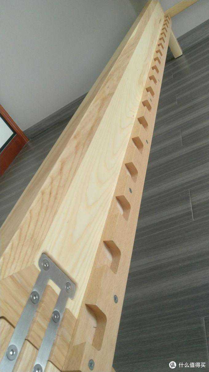 床头板采用3-4块大板直拼,并且拼板时用的是较为少见的手指榫,床头处的两根床腿同时也是床头大板的穿带榫固定结构,明显比我那张光阴木器床来的良心。除了床体较为厚实的用料以外,最大的特色是排骨架采用了4cm粗的榉木方木,承重能力MAX,看着很爽。