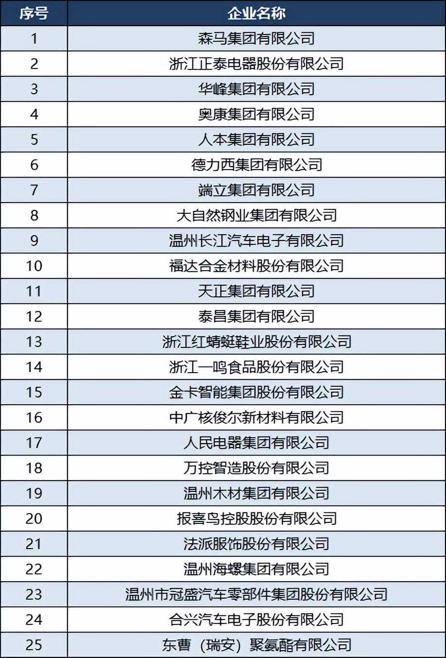 根据2022年底温州市发布的“2022温州制造业企业50强名单”,排名前十的制造业企业为:森马集团、浙江正泰电器、华峰集团、奥康集团、人本集团、德力西集团、端立集团、大自然钢业集团、温州长江汽车电子、福达合金材料。