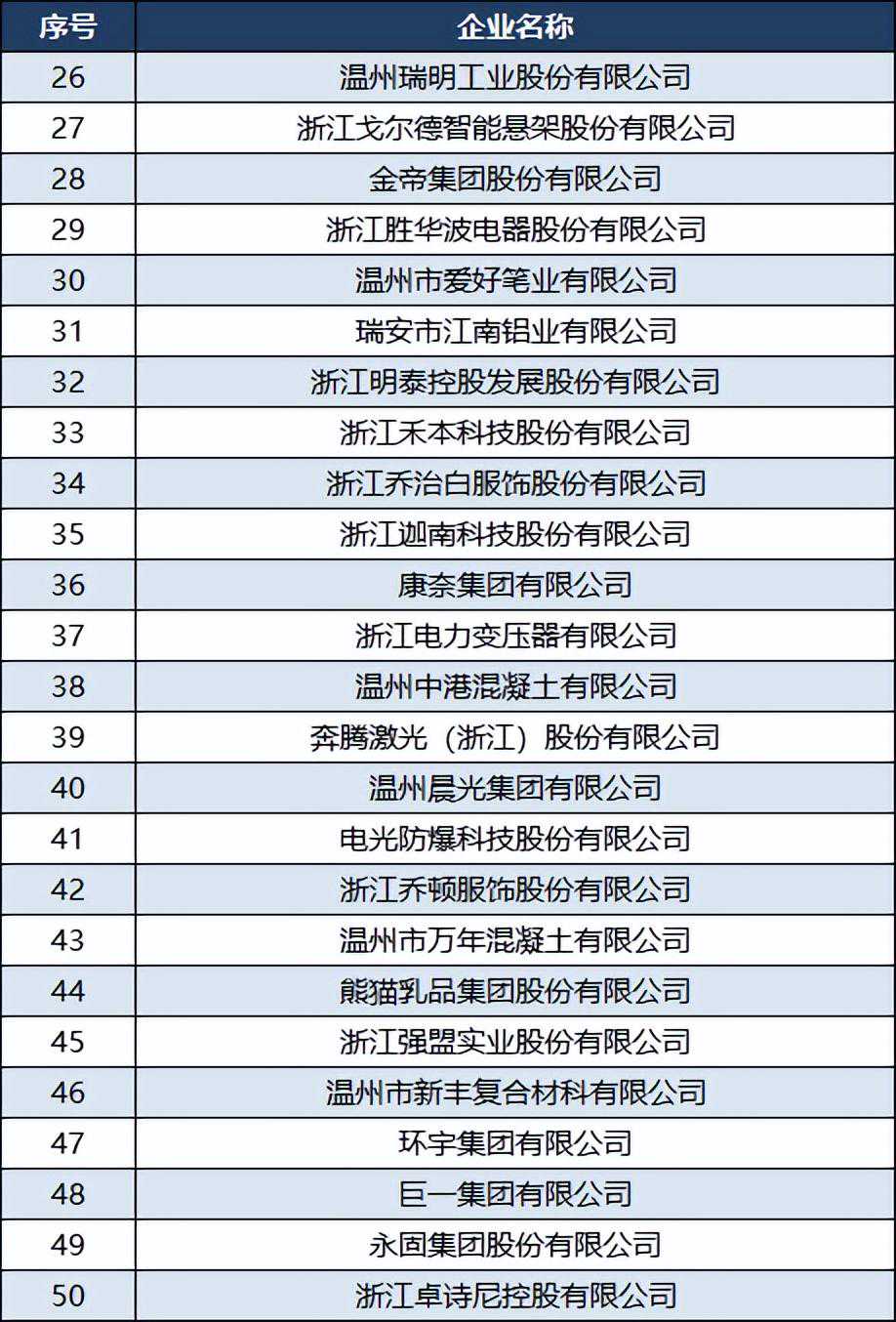 合兴汽车电子股份有限公司排名第24位,东曹(瑞安)聚氨酯有限公司排名第25位,温州瑞明工业股份有限公司排名第26位;