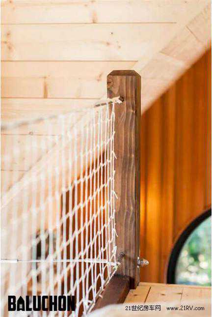 通往阁楼的楼梯可以用于储物。阁楼放置了一张睡床,床边安装了保护网,防止夜间睡眠翻身跌落的危险。