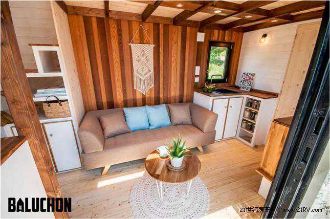 Ostara移动木屋采用双轴拖车、松木车身和合金屋顶构成。走进木屋,首先映入眼帘的是一个1.8米长的沙发,可以转换成双人床。沙发的右侧是厨房区域,分为两个部分,设施包括水槽、冰箱、置物架和炉灶等。