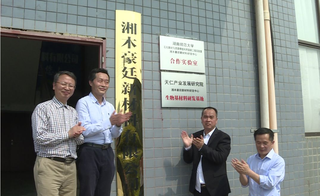 2019年4月9日上午,湘木豪廷新材料有限公司隆重举行“湖南师范大学石化新材与资源精细利用国家工程实验室合作室验室、天仁产业发展研究院生物基材料研发基地”揭幕仪式。