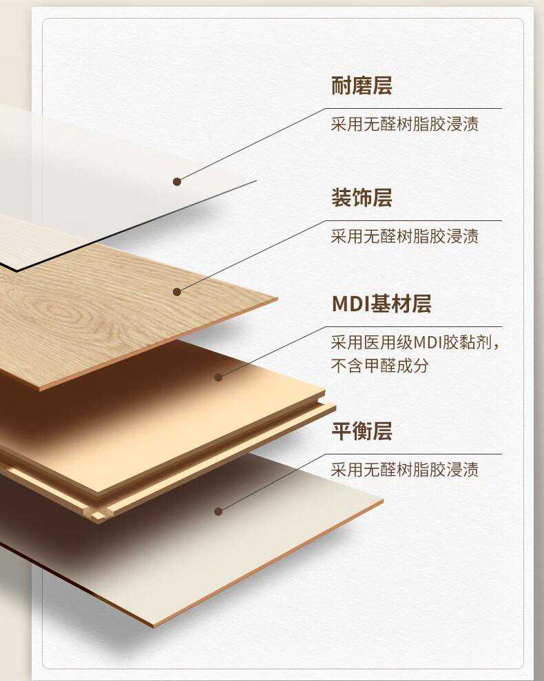 实木复合地板是由不同树种的板材交错层压而成,保养周期长,兼具强化地板的稳定性与实木地板的美观性。层数越多,越不环保,价格越低。