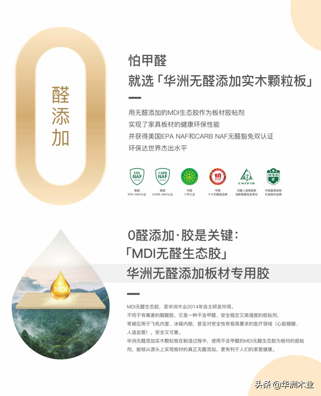 板材环不环保主要看胶水。华洲采用MDI无醛生态胶作为板材的胶粘剂,从源头杜绝了甲醛的产生,实现了真正意义上的0醛添加。