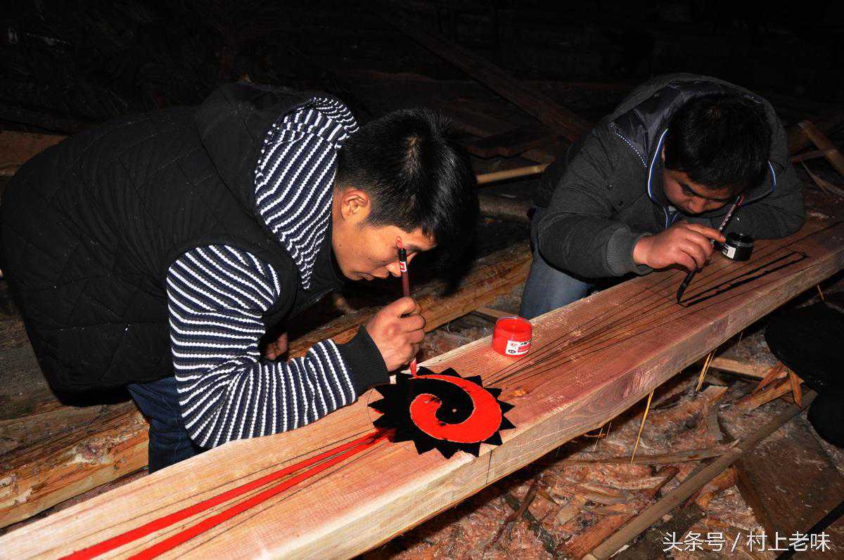 掌墨师傅梁木划墨,配吉祥图。在动手之前,还要将几句吉庆垒词:“宝梁宝梁,闪发毫光。用尺一量,不短不长。安在中柱上,铁稳铁当”