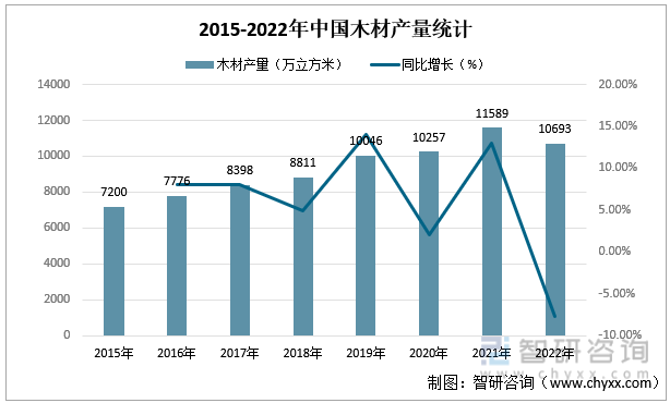中国森林资源丰富,2021年中国森林面积达22044.62万公顷,森林覆盖率达23%,中国每年木材生产量位居世界前列。2015-2022年,我国木材产量整体呈上升趋势,2021年,我国木材产量为11589万立方米,较去年增加了1332万立方米,同比增长12.99%,2022年,我国木材产量稍有下滑,为10693万立方米,较去年减少了896万立方米,同比下降7.73%。