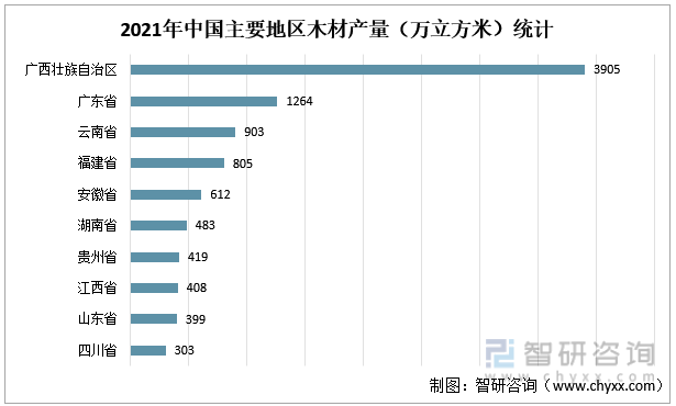 2021年,广西壮族自治区是我国木材生产的第一大省份,产量为3905万立方米,占当年木材总产量的33.70%;广东省排名第二,木材产量为1264万立方米,占当年木材总产量的10.91%;云南省排名第三,木材产量为903万立方米,占当年木材总产量的7.79%。