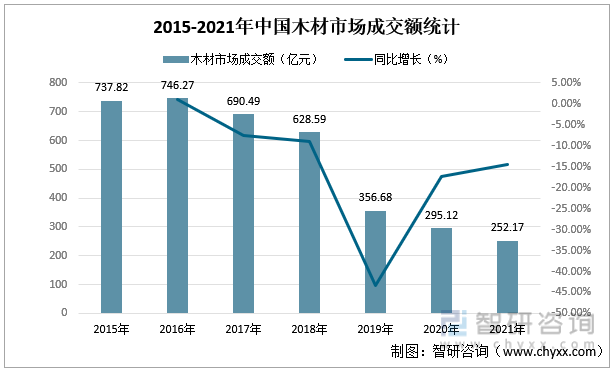受房地产市场低迷等因素的影响,近几年木材市场成交额不断萎缩。2020年,中国木材市场成交额为295.12亿元,较2019年减少了61.56亿元,同比下降17.26%;2021年中国木材市场成交额为252.17亿元,较2020年减少了42.95亿元,同比下降14.55%。