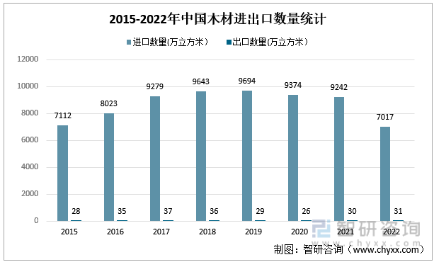 2015-2022年中国木材进出口数量统计