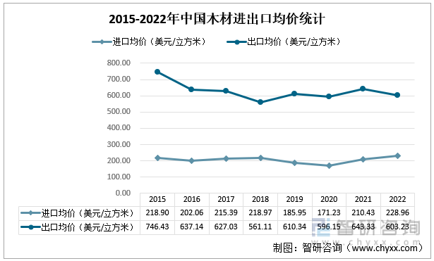 2015-2022年中国木材进出口均价统计