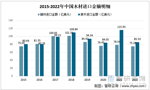 2015-2022年中国木材进出口金额统计