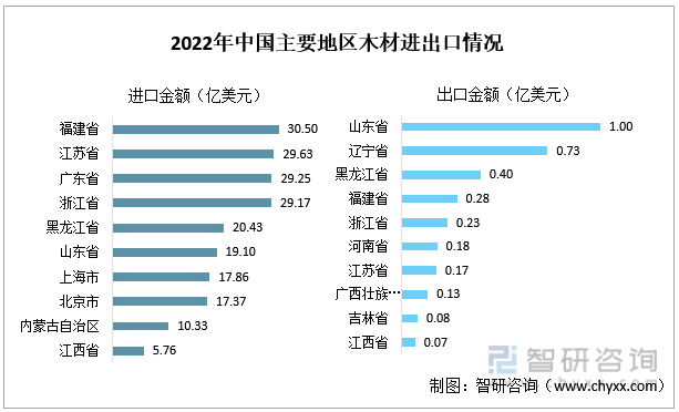2022年中国主要地区木材进出口情况