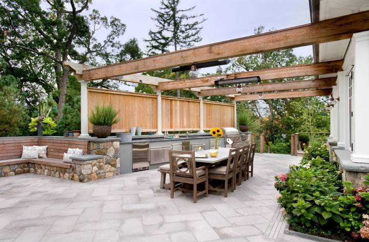 廊架不仅可搭配植物圈围出舒适的景观性休闲空间,也可用于功能区域的划分和装饰如停车廊架、烧烤台廊架等。