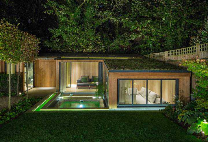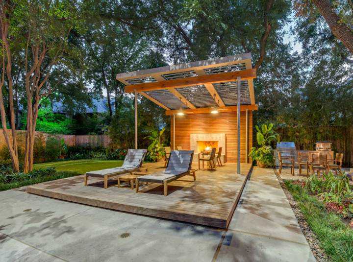 庭院多见亭子,有四角亭和六角亭,四角亭适合现代及新中式风格,而六角亭适合欧式风格庭院。木亭周围往往搭配植被、鱼池、假山等,以此来打造景观功能于一体的休憩区域。