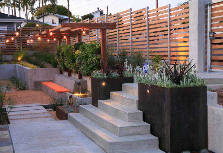 一般自然风格的小庭院,也可考虑搭设拱门花架,或三角花架,将直角空间有效利用,既能营造景观休闲空间,又能节约占地。