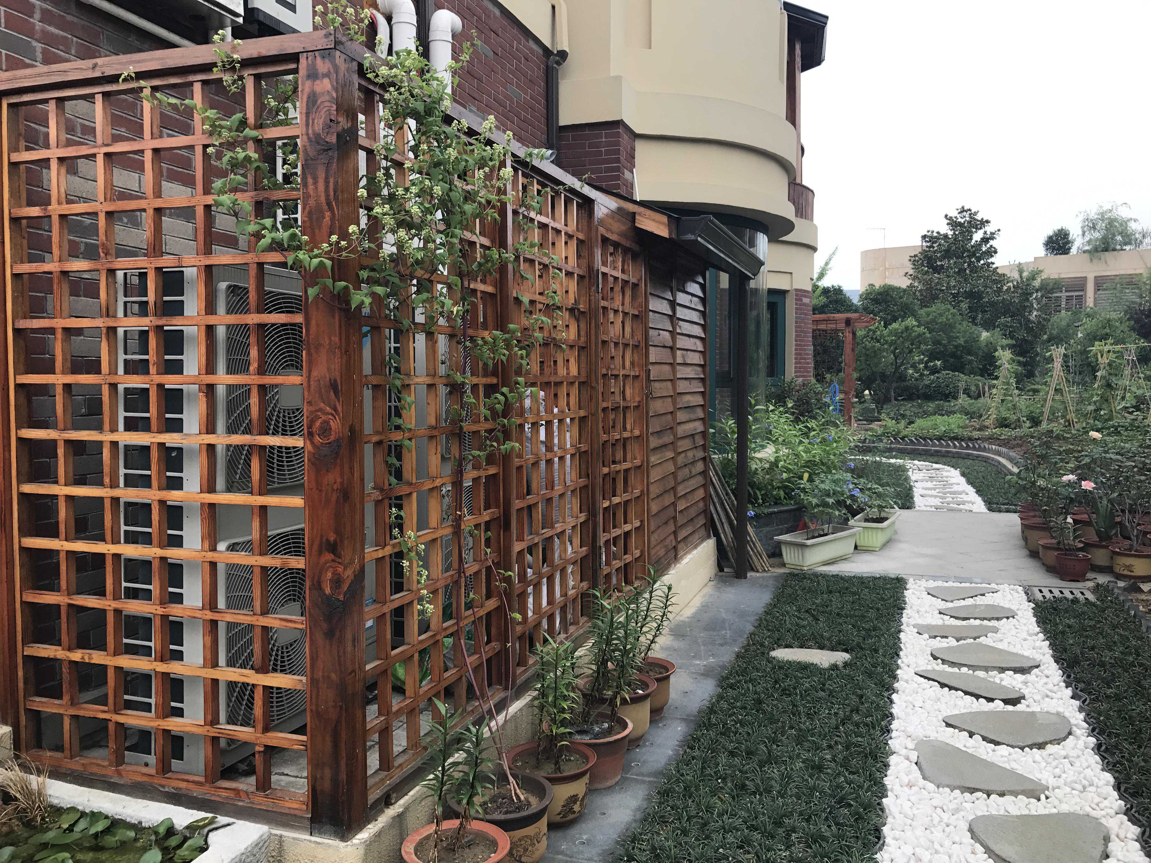 设备房多由木网格、木跌板、木百叶等构成,多用于空调机等外机摆放,或者作为工具储存箱箱使用。这能防止雨水及暴风的侵蚀。