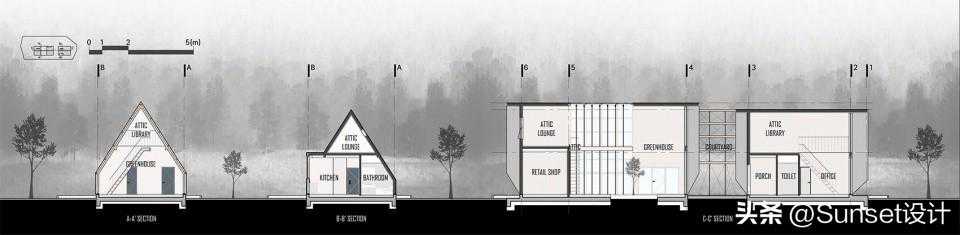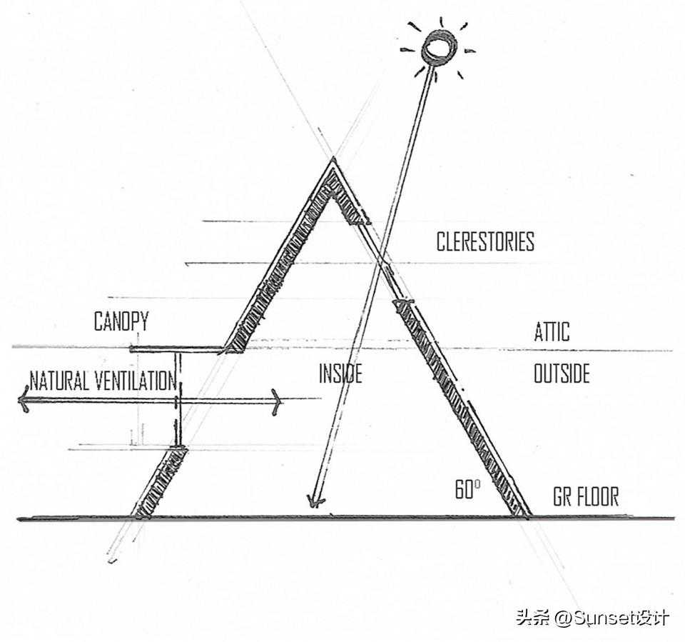 建筑物被打造的像树一样意味着什么?树木根据不同的种类会有不同的类型、形状和特征。但是,人们记忆中树木最常见的、也是最原始的便是三角形。几何是最完整和简单的形式,设计者发现三角形能够将建筑物地墙壁和屋顶组合在一起,常用的SPF结构木材的长度为20英尺(6.1米),如果使之倾斜60度,则无需额外木材,就能够堆叠成三层楼。