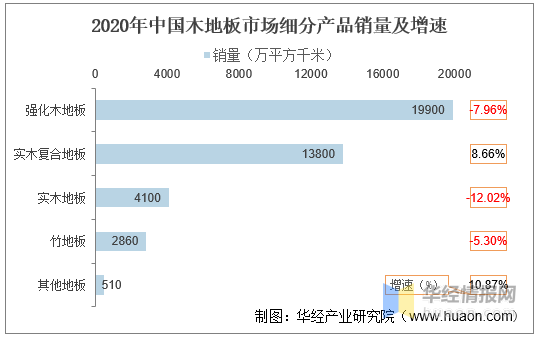 从细分产品销量来看,2020年受到疫情的影响,装修建材市场出现了不同程度的市场萎缩。在木地板领域除了实木复合地板以外,其他木、竹地板均出现了不同程度的下降。2020年强化木地板销量为19900万平方米,同比下降7.96%,而实木复合地板销量则增长至13800万平方米,同比增长8.66%。实木复合地板按种类分成多层复合地板和三层复合地板,由几层原木通过黏胶进行胶合,其脚感和质感取决于表层的木层,越厚的脚感越好,接近于纯实木的质感。