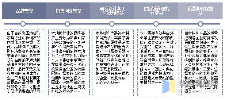 对于试图进入木地板行业的新企业来说,主要会面临品牌壁垒、销售网络壁垒、研发设计和工艺能力壁垒、供应链管理壁垒、质量和环保壁垒等五大方面壁垒。
