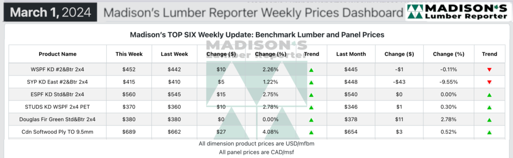 截至2024年3月1日当周,西部SPF2×42BTRKD(RL)的价格上涨了52美元,即13%的涨幅,目前价格为452美元。